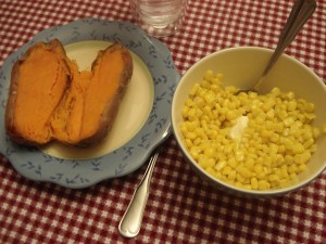 For dinner I had a baked sweet potato and corn. I really wasn’t too hungry and this was just enough. Made Taylor a pot pie for dinner and made Mommy sauteed veggies and chicken.
