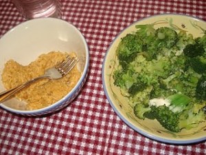 Dinner was rice and broccoli. I made Shake and Back pork chops for Mommy and Taylor. Pork is one of those meals that I use as a filler when I have no other ideas. I like to throw in a bbq crock pot pork like once a month or once every two months. Such an easy meal.