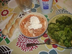 Dinner was spaghetti with marinara sauce and bread sticks. Oh my…it was quite delish. I mixed in parm and ricotta cheese with my spaghetti. And I had two bread sticks with it. We also had broccoli. I made Taylor’s spaghetti with meat sauce and Mommy had just ground beef with cheese and onions. Also made her a little side salad. I had a McDonalds Unsweet Iced Tea with my meal too. I got it for Mommy on my way home then knew she would probably complain about it. So before I went to soccer, I went to Moes and got her a tea from there. Jeez…I am nice.