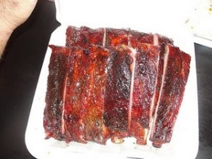 Next turn in was for Ribs at 12:00pm. Ribs came off the grill and looked like winners. They had the perfect color to them and smelt great. I don’t eat pork, so I did not try them. As Gino was slicing them and making the box, Mommy got to try some of the ribs. She said they were the best ribs she has ever eaten. She said that the meat was so tasty and juicy. The smoke ring on the ribs looked excellent as well. I headed over with the turn-in box and was the first one to arrive. I turned the Ribs in at 11:55am.