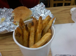 Five Guys offers not only burgers, but hot dogs and grilled cheese as well. I have only ever had their burgers but, I have heard good things about their hot dogs as well. Their fries are offered in either regular or Cajun style. Five Guys offers a wide variety of toppings for your burgers all free of charge. I always order the same thing at Five Guys and normally don’t get any reaction from the workers. The last time I was at Five Guys though, I got a serious reaction. A no-way-can-you-possibly-eat-all-of-that-food-and-not-be-sick type of reaction.