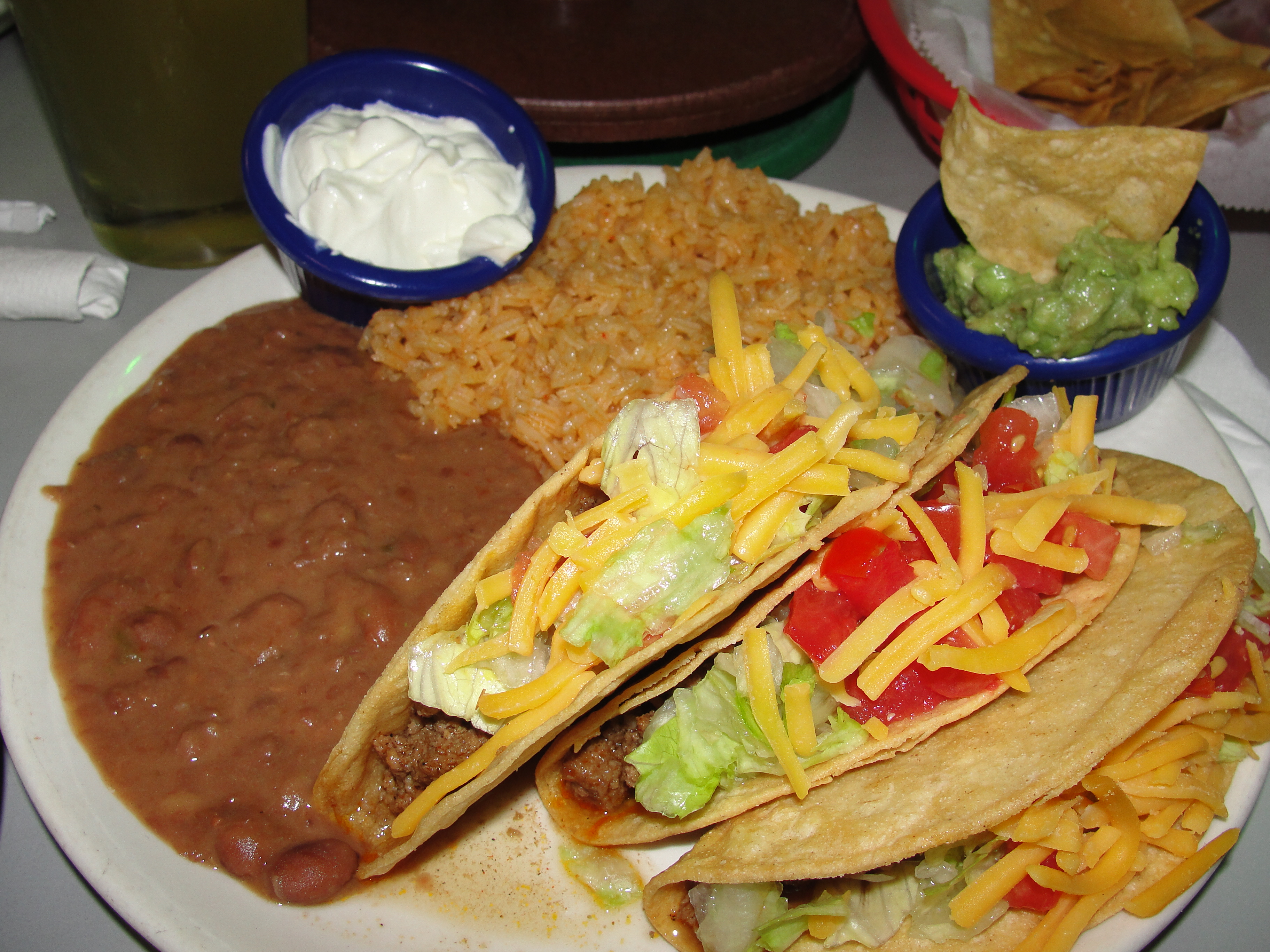 Tacos…mmm, Tacos. One of my favorite Mexican food items by far. The hard shells were so fresh and crispy. They were loaded full of ground beef, lettuce and shredded cheese. They certainly do not skimp on toppings – in the tacos or any other food items. I ordered these Supreme which meant they came with sour cream and guacamole on the side. I added sour cream to each of my tacos but ate the guacamole with my enchiladas and chips. The tacos had a great flavor to them thanks to the combination of fresh, good ingredients. The hard shell’s crispiness was able to withstand the ground beef and toppings. The ground beefs flavoring was also very fresh & tasty. Once again, you could tell the beef was cooked slow to allow the seasoning to really flavor it well – not a fake flavoring like you get from a packet. The lettuce was fresh and plentiful as was the shredded cheese. The key to these tacos was really the freshness and the authentic flavors. The sour cream was creamy and added the perfect coolness to the tacos. The guacamole was also very fresh however, I only got a few bites worth and can’t really rate it. Overall Rating: 10/10.