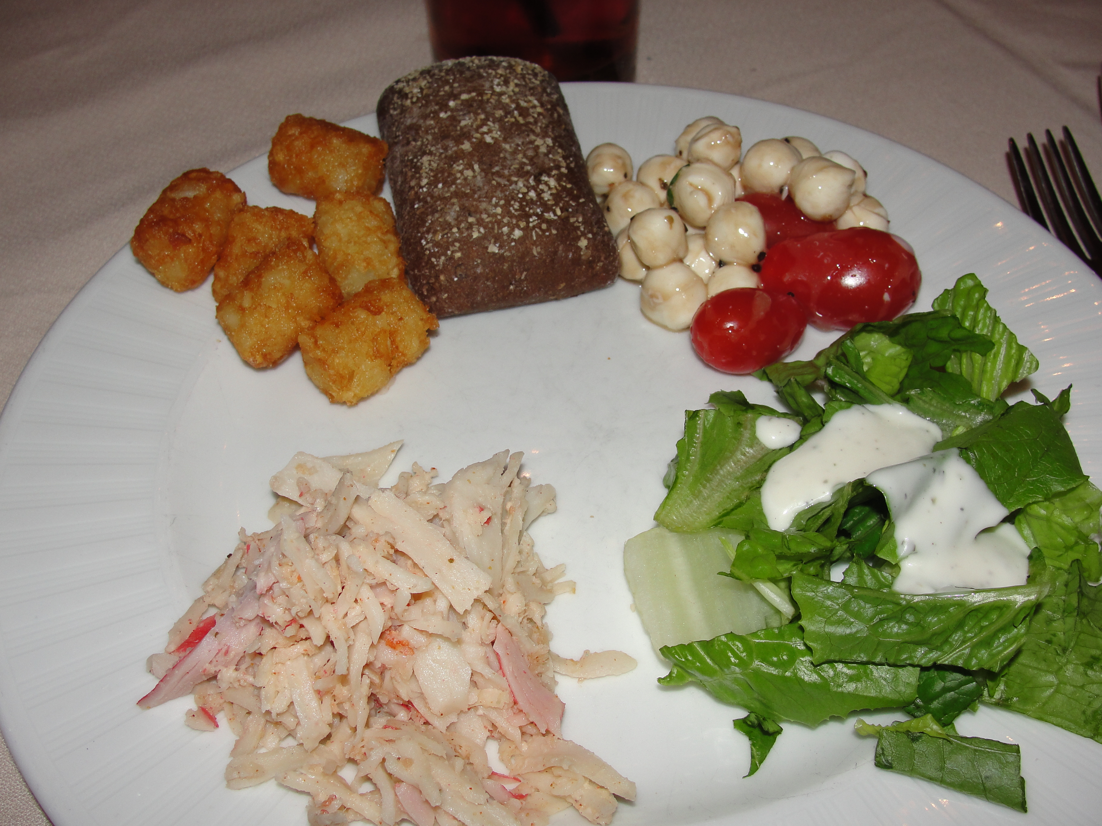 My second plate consisted of more salad & dressing, more of the mozzarella & tomato salad, another piece of the brown bread and (new) the Lobster & Crab Salad and some Tater Tots from the kids buffet table. The Lobster & Crab Salad was amazing. It was served cold and was simply pieces of crab and lobster mixed together. The crab chunks were large and super fresh. The crab was so delicious – sweet and fresh. You could taste the freshness in every bite…you could really tell it was good, quality crab. The lobster was amazing as well. My salad had huge chunks of lobster that was sweet and also very fresh. The combination of the crab and lobster made for a simply delicious salad. Tater Tots are one of my favorites and I never really have them too often. I visited the small kids table and got a few. The tater tots were not too salted – which was a good thing – and had a crispy exterior with a soft interior. They were hot and fresh and went well with the cold salads. Plate two down and delish.