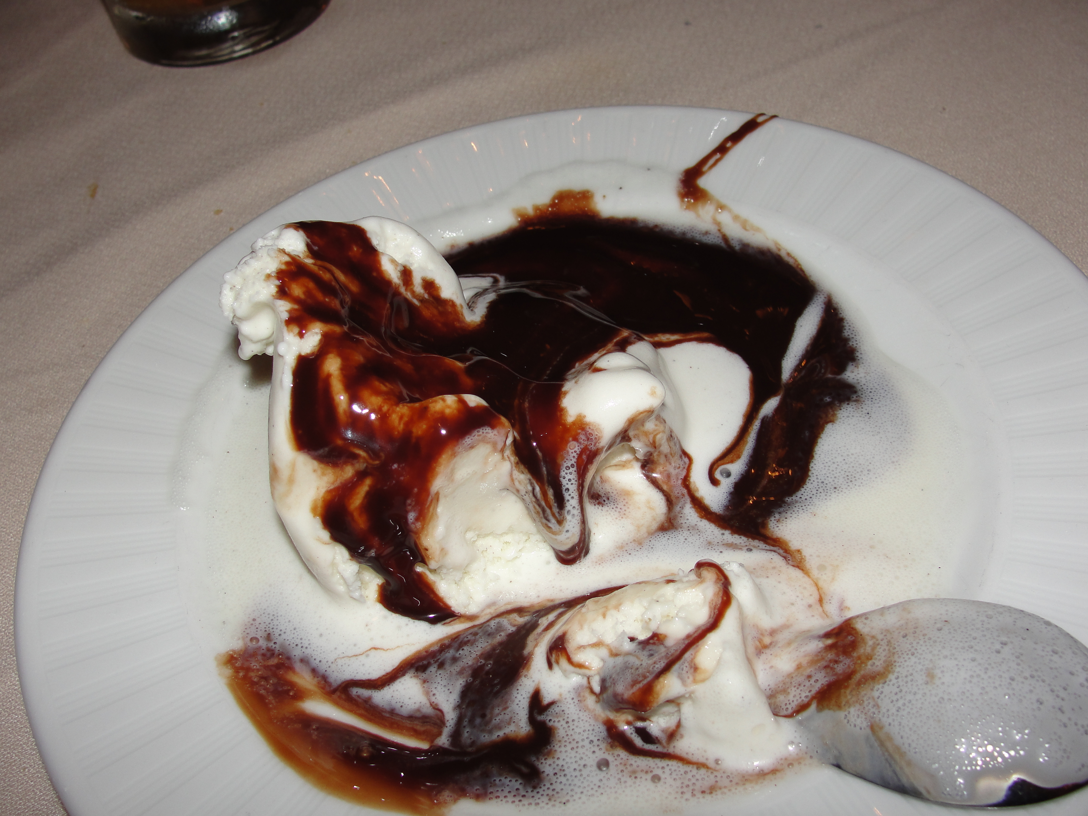 On the menu, they advertised a sundae bar and seasonal pies and desserts. I was really looking forward to this and was disappointed when I found that it was only ice cream and a few toppings. I got a scoop of ice cream and put hot fudge on it. I was shocked that they didn’t have bowls for the ice cream and the plates were warm. Hmm. I got back to the table and began to eat the ice cream. I found right away that the advertised hot fudge was actually chocolate syrup. This really bummed me out because I just love hot fudge. The ice cream was vanilla and decent. The chocolate syrup had the normal fake taste to it and just was okay. Nothing great here for dessert round 1.