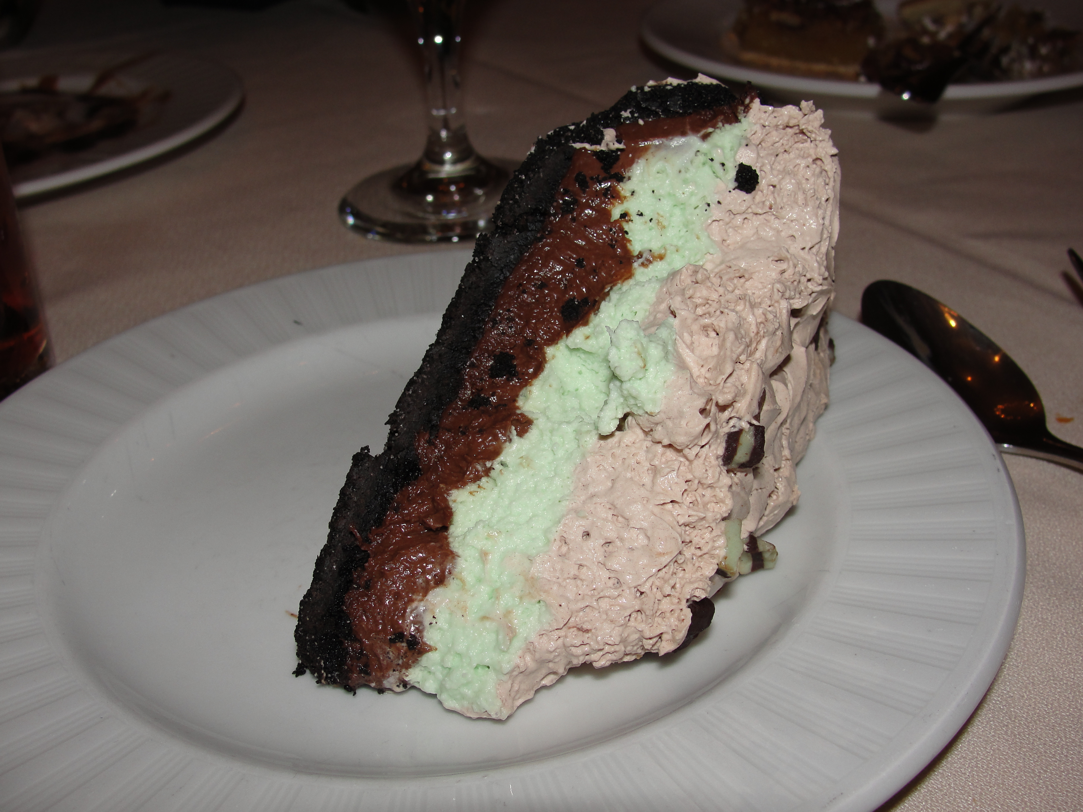 I am not a big pie person and was expecting additional dessert items to the pie. They did have a berry cobbler along with a bread pudding but I do not fancy either of these items either. I tried a piece of the Mint Pie but passed on all other choices. The mint pie had a chocolate crust, a chocolate pudding layer, a mint whipped mousse layer and a chocolate whipped mousse layer. I was not a huge fan of the whipped mousse inconsistency but the flavor of these layers was good. The mint layer had a true mint taste and did not taste fake and processed. I really enjoyed the chocolate crust and chocolate pudding layer in the pie. The chocolate crust was semi-sweet and worked well with the rich chocolate pudding layer. I ate all of that and some of the whipped mousse layer. I simply just couldn’t do all of the consistency of the whipped mousse layer. Dessert completed.