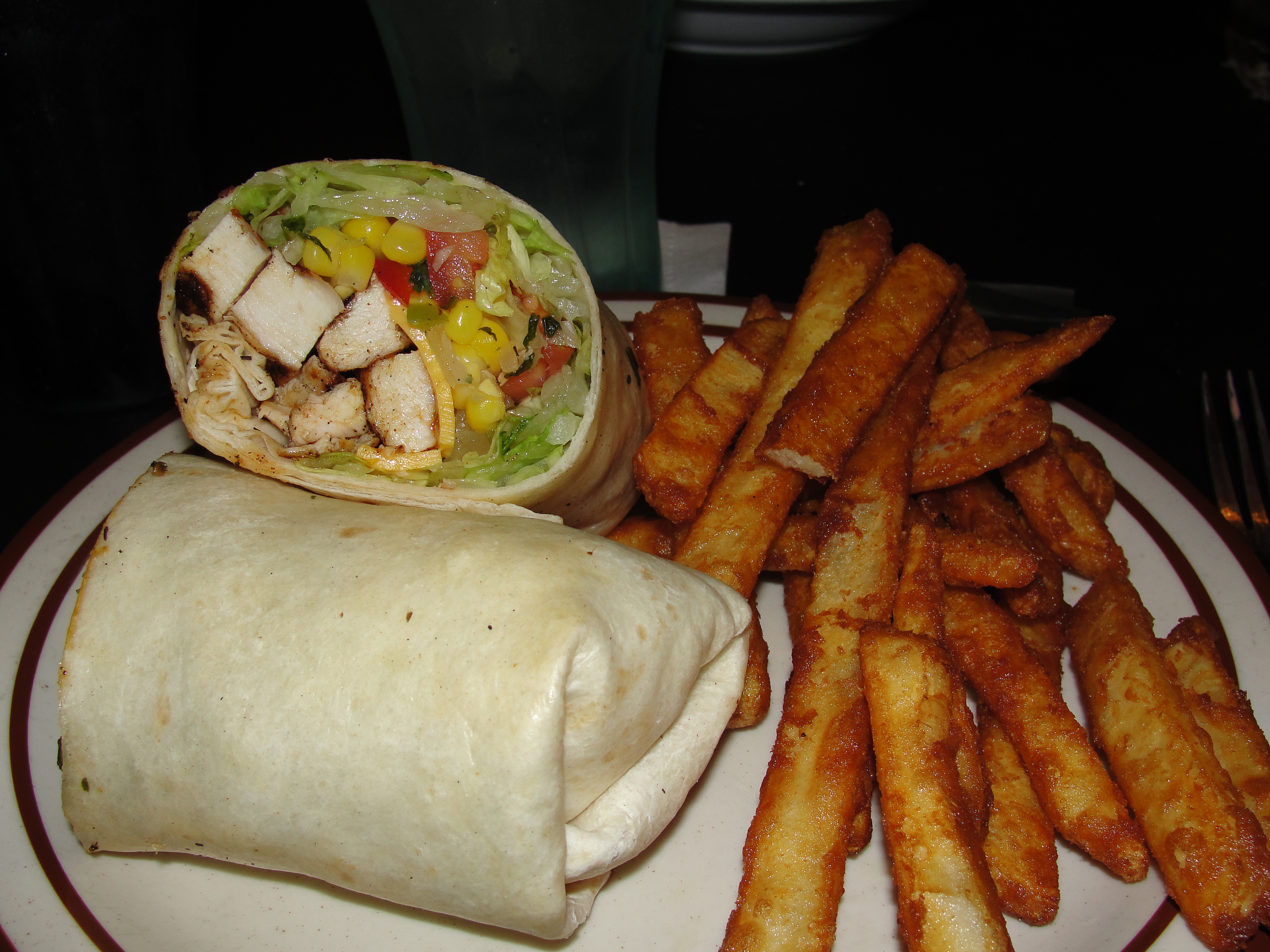 The Southwestern Chicken in a tortilla (this was not the real name of the menu item…I just didn’t write it down and don’t recall) consists of grilled chicken, lettuce, corn salsa, shredded cheese and a house sauce. This was served with a good sized serving of fries. The tortilla was huge and packed full of ingredients. The tortilla had a slight flour taste but I really didn’t get any other flavors from it. The chicken was very warm and in large pieces. The chicken had flavors of cumin, chipotle and pepper and was really good. It was moist and had a great consistency.