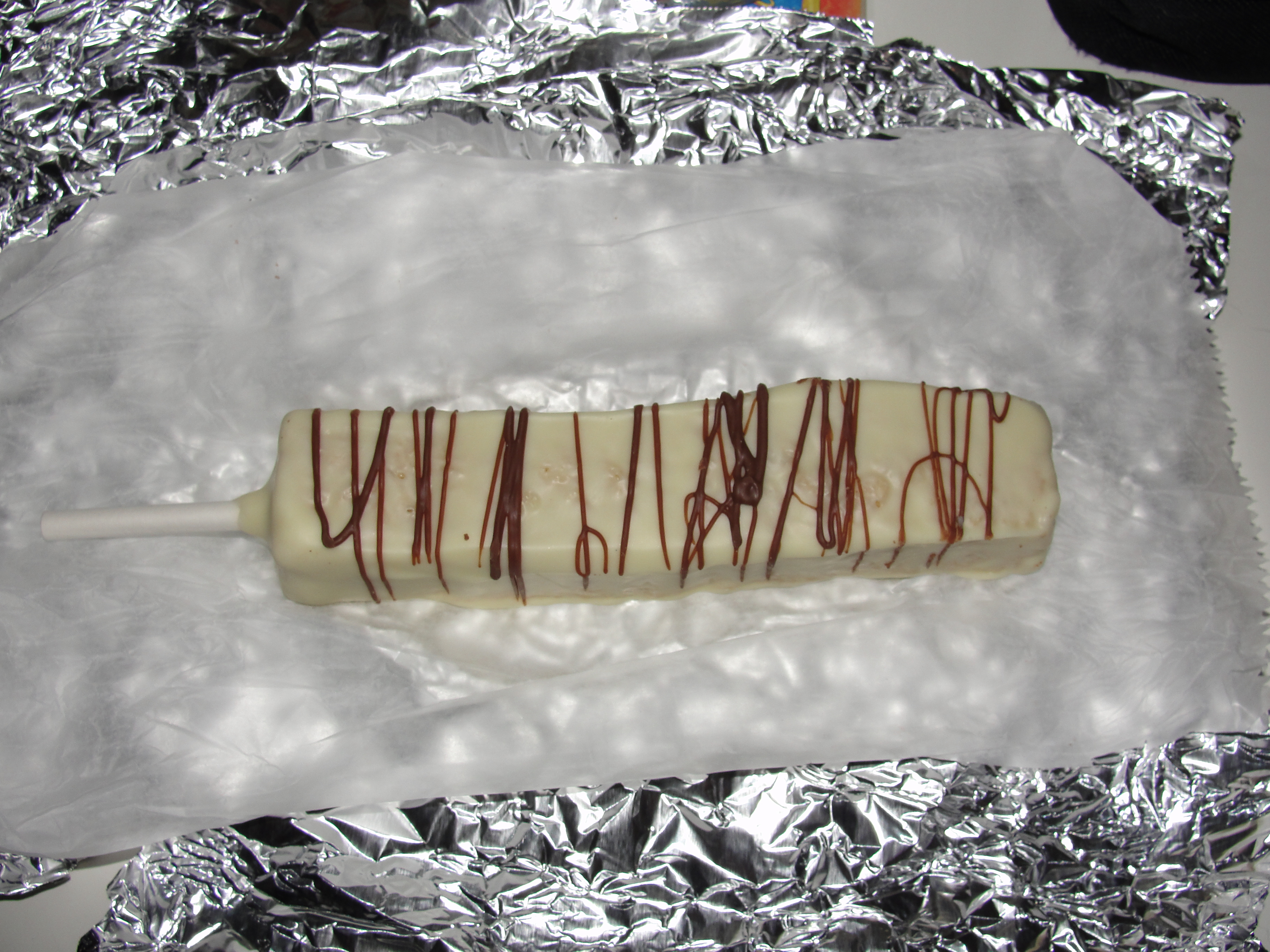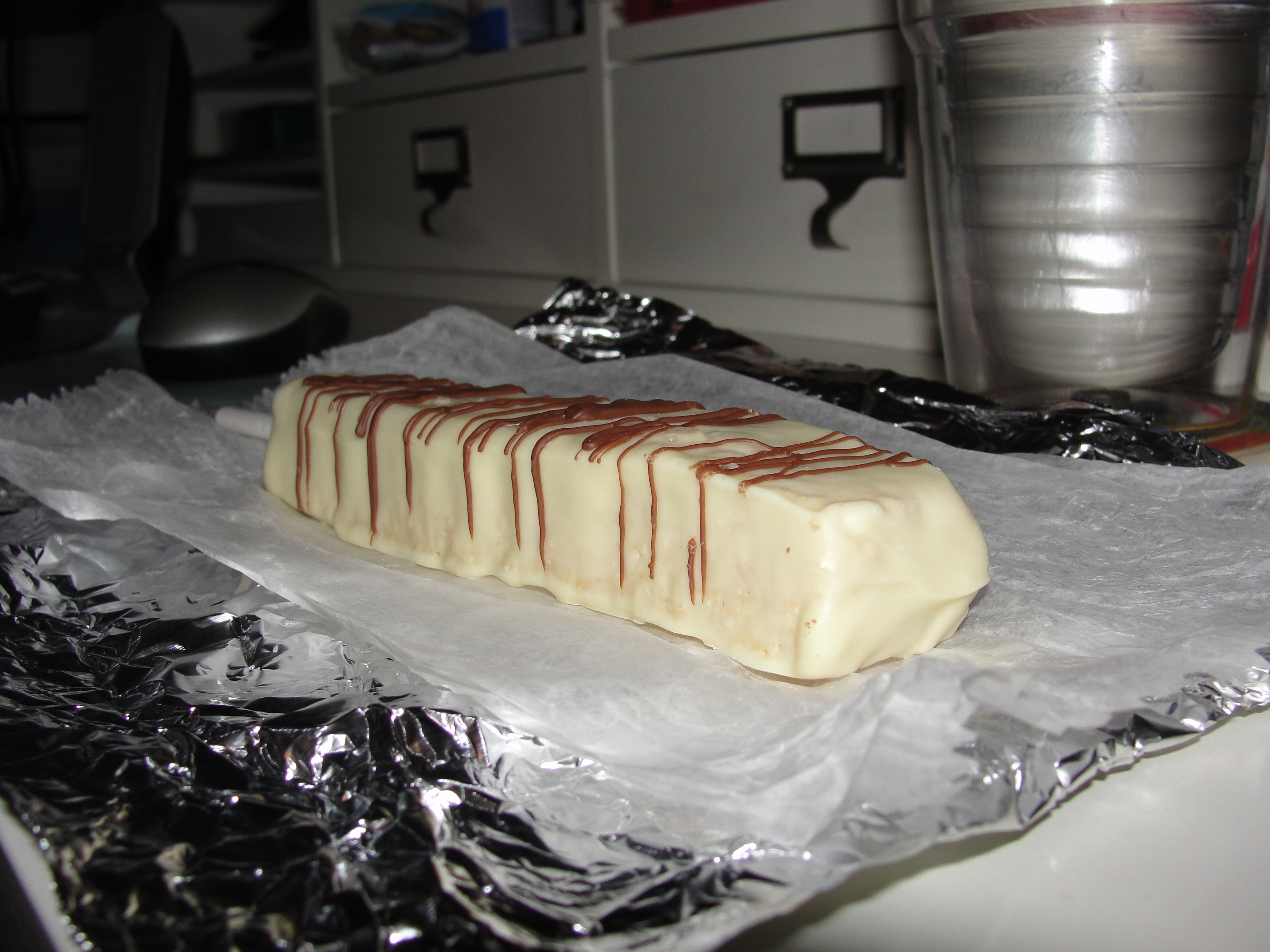 I started the RKT and was pleased that it was still very moist on the inside. Even though the RKT was completely covered in white chocolate, the chocolate was not to the point of being overpowering or too much by any means. The layer was light, simple, delicate yet provided a fantastic additional flavor. Each bite contained a very large amount of RKT and a perfect amount of white chocolate accompaniment. I could not really taste the milk chocolate drizzle but this is really due to the fact that white chocolate is very sweet. This white chocolate was certainly sweet and had a lovely flavor both while I was chewing each bite and after I had swallowed each bite. I also appreciated the smoothness that I received from the white chocolate.