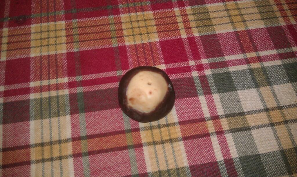 The time finally arrived and I carefully removed the baggie of Buckeyes from its gift box. I opened up the bag and immediately received whiffs of peanut butter. I removed a very large, oversized Buckeye from the bag and took a few moments to awe at it. The Buckeye was huge and had a large peanut butter center. I was also surprised by how heavy the Buckeye itself was. There was a lovely outside covering of chocolate and the peanut butter inside was calling my name.