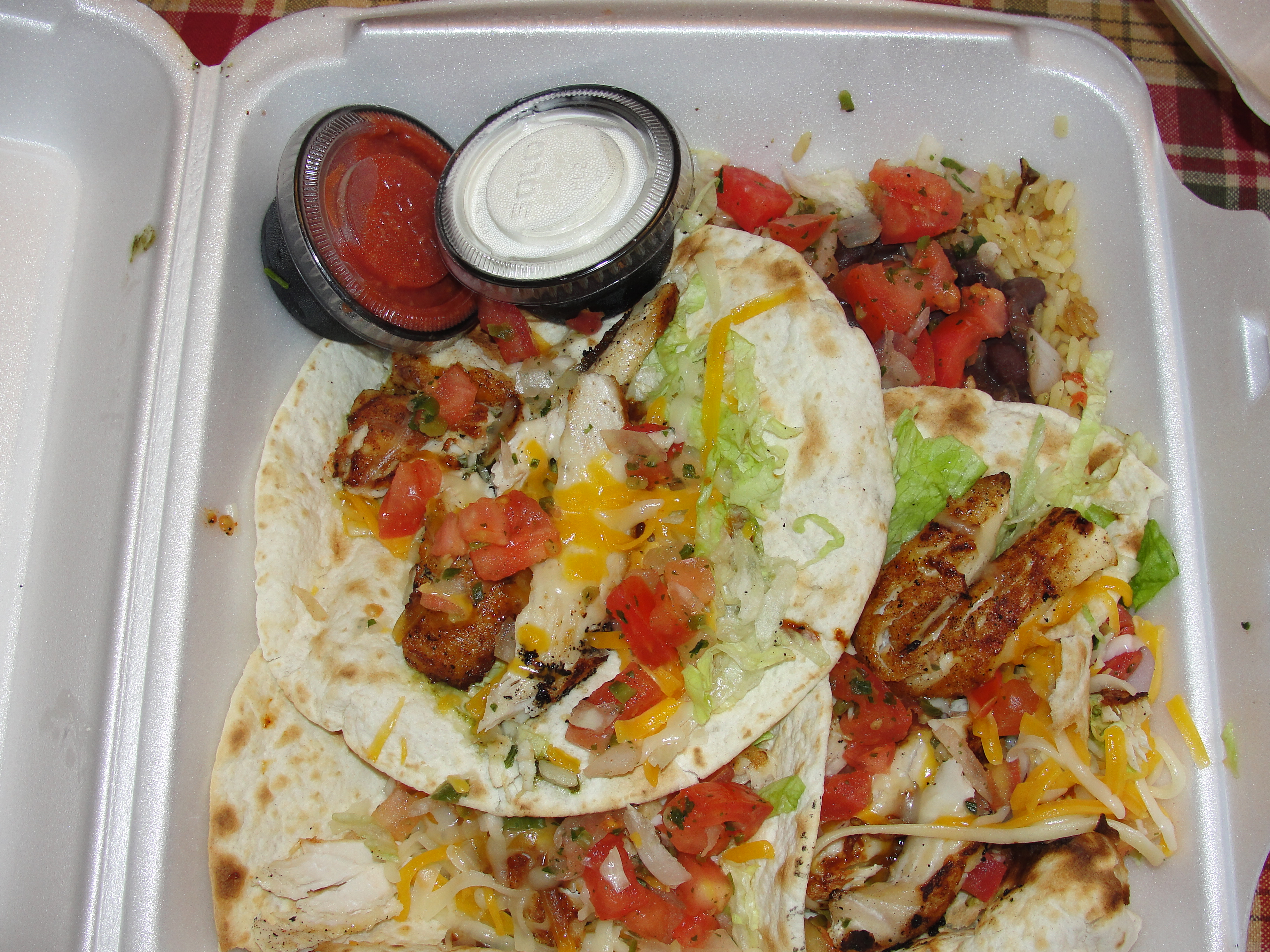 While eating these tacos, I apply sour cream and cocktail sauce to each taco. Not a ton of either but enough to taste and appreciate the flavor. I also mix together the heaping serving of rice and beans and sometimes will dip my fork into the sour cream or cocktail sauce prior to scooping up some rice and beans. Okay, enough on my weird eating tendencies, let’s get to the food.