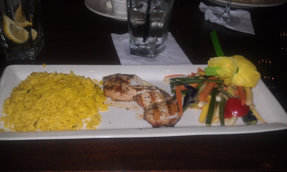 When creepy waiter finally returned with my cocktail sauce, I began to slowly eat my small portion of mahi-mahi. The first thing I noticed is that it did not seem to be overcooked – a good thing for sure. I tasted the mahi-mahi and found its flavor to just be okay. Perhaps a bit salty. As I continued to eat, I used cocktail sauce with the fish and found its flavor to get increasingly salty. I can only contribute this to the sodium-filler it was in to preserve it. The fish did not have any grill flavor to it at all even though it was sporting some grill marks. After eating more and more of my tiny mahi-mahi portion, I realized that it was not cooked the same throughout. Some bites were cooked perfectly while other bites were somewhat undercooked and soggy.