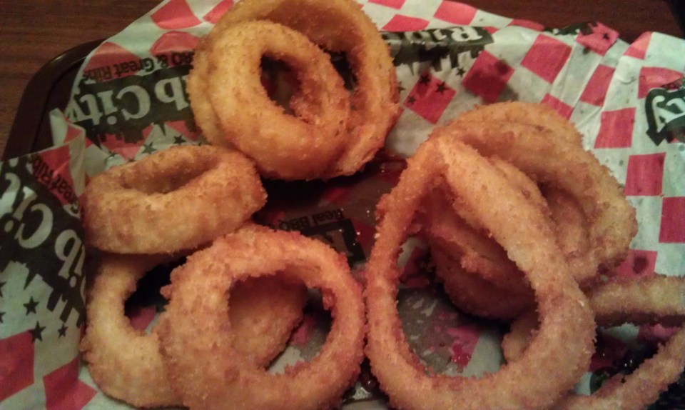 We decided to order a batch of onion rings as an appetizer. Onion rings are one of those foods that just go so well with barbeque. The onion rings arrived quickly and were piping hot. I let them cool down for a few moments and put some sauces on my plate. Rib City has three sauce choices: Sweet, Tangy and a Mustard-Barbeque. Before I dipped the onion rings in, I tasted each sauce.