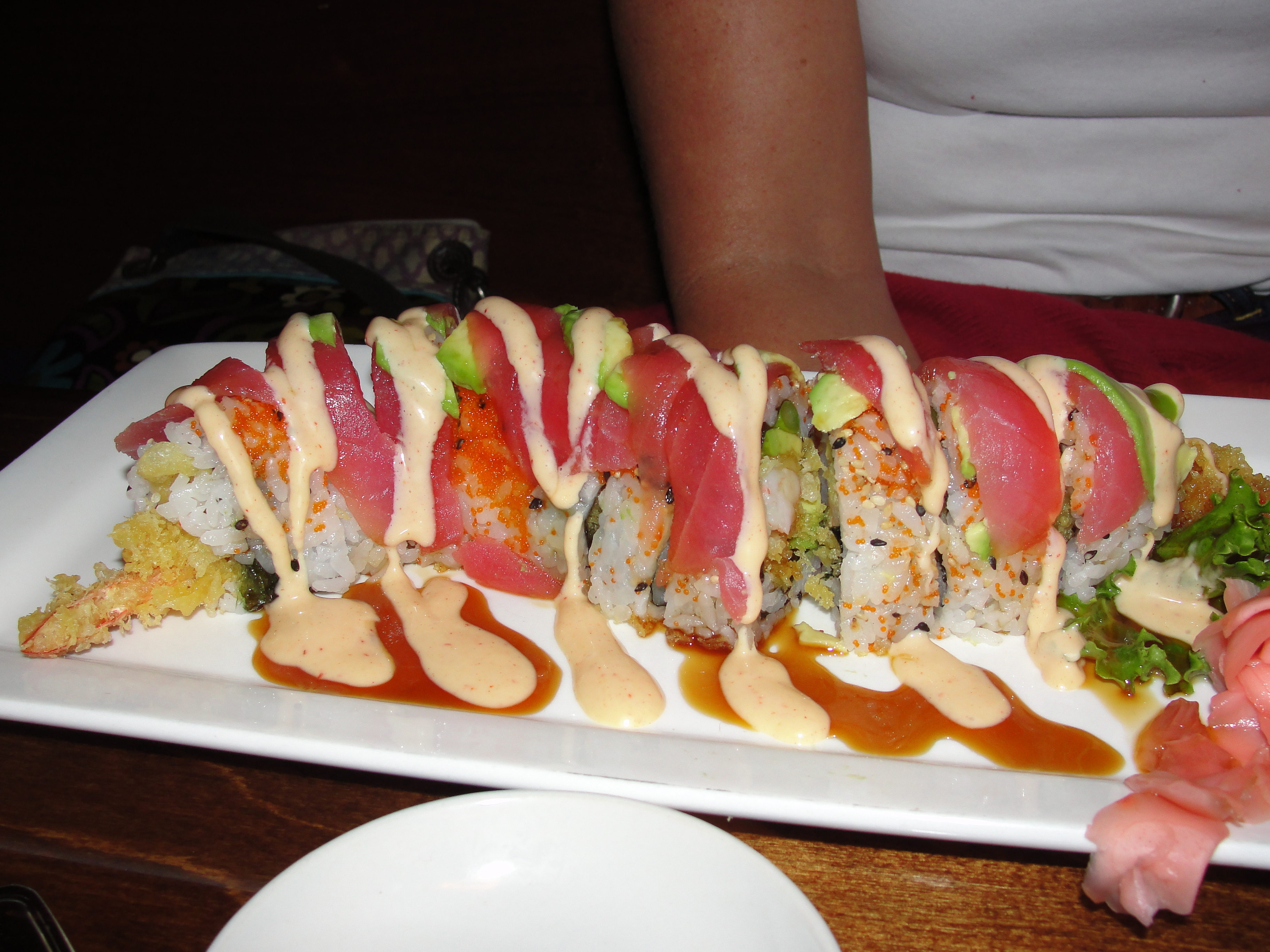 The tuna slice on top of the roll was thin and provided the perfect flavor to the roll. It didn’t really change the consistency which did surprise me. The avocado on top, while not a lot, provides that familiar smooth avocado flavor and taste. I also really love the spicy mayo that they use. The consistency is very thin and the flavor is not at all spicy. I love the sweetness of the mayo and how it works so well with the roll. Red is a winner.