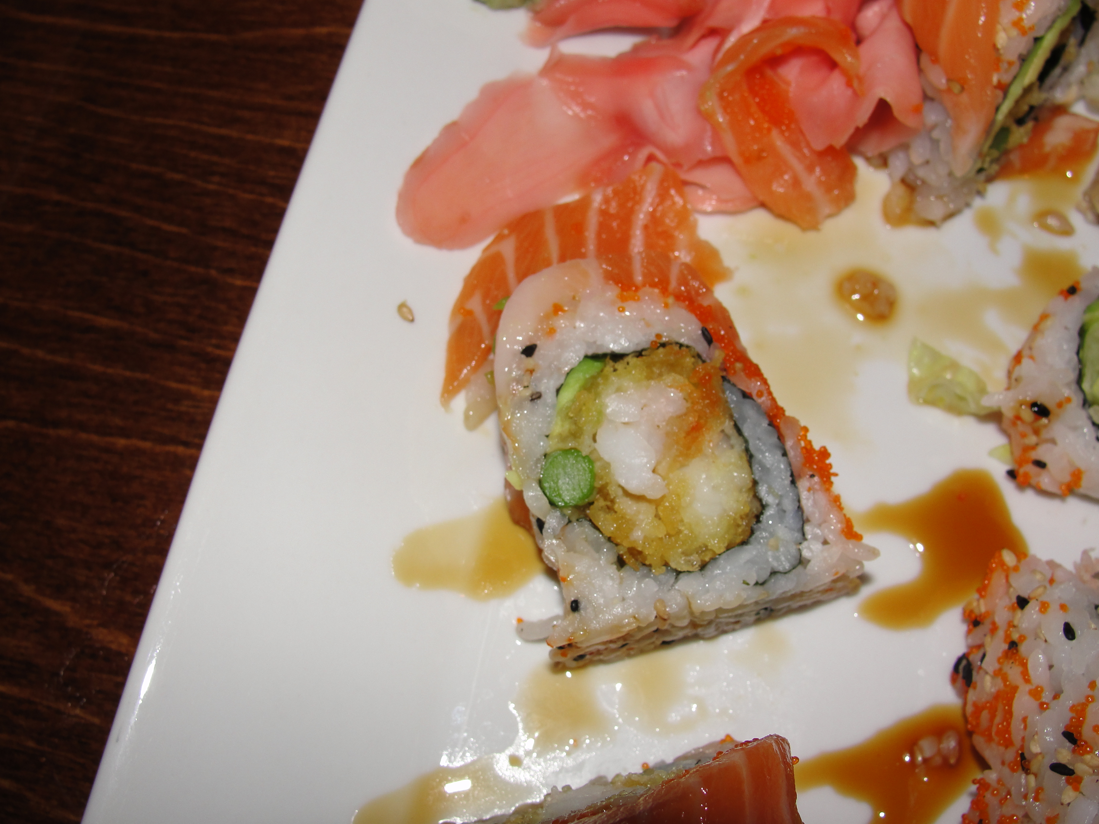 The Red Dragon Roll consists of a Shrimp Tempura Roll with Tuna and Avocado on top. This was my first time with sushi containing shrimp tempura. I did not think I would like it at all but was pleasantly surprised that I did. The biggest thing about Sushi Thai is that they serve up huge rolls. I mean the diameter on these suckers are like double the usual size. This results in a very awkward large bite where you keep your head down and hope no one is starring at you wondering why you are shoving your face. Good thing is, they are doing exactly the same thing.