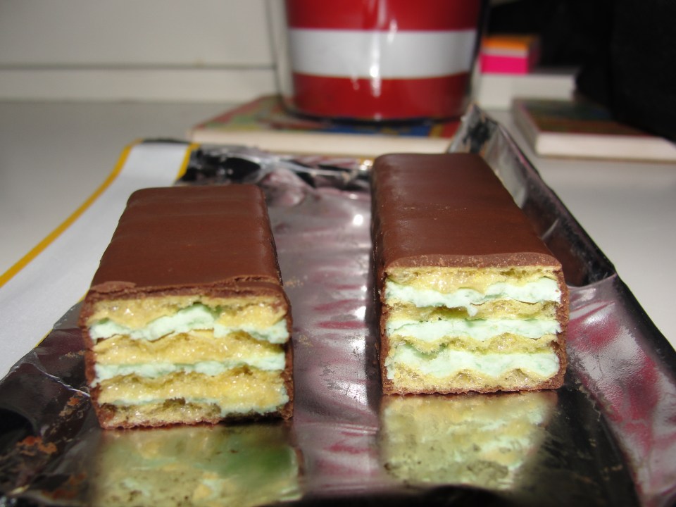 I opened up the Mint Stick and smelt mint right away. This did concern me as I was fearing the artificial flavor of mint would be the only flavor I tasted. I broke the stick in half, and after taking a photo, began to eat. As I bit into the stick, my mouth was hit with layers of fudge, mint and wafers – a tasty combination my mouth was more than happy to have. I chewed each bite and the three layers of the stick blended together perfectly each and every time. With every bite I felt as if I had perfect amounts of fudge, mint and wafer.