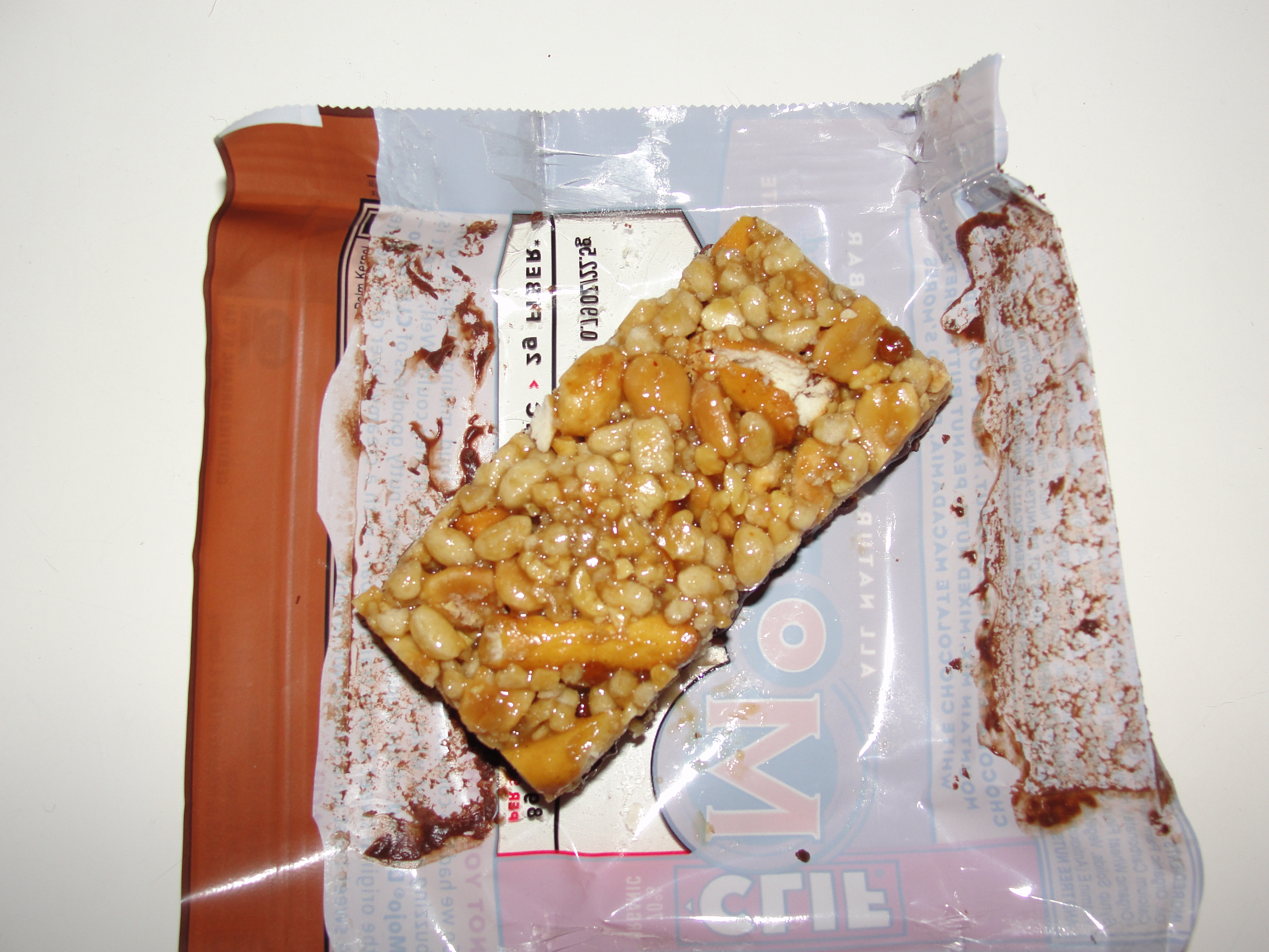 As I opened this bar, I saw many components to the bar. There appeared to be chunks of granola, peanuts and pretzels. The bottom of the bar was lined with chocolate. I broke the bar into three pieces and placed the first piece in my mouth. The consistency of the bar is what hit me first – before the taste, flavor or anything else. The consistency was odd. It was not crunchy but rather chewy to the point of being manufactured. Does that make any sense? Odd and psedo was the consistency. Also known as Gross and Disgusting.