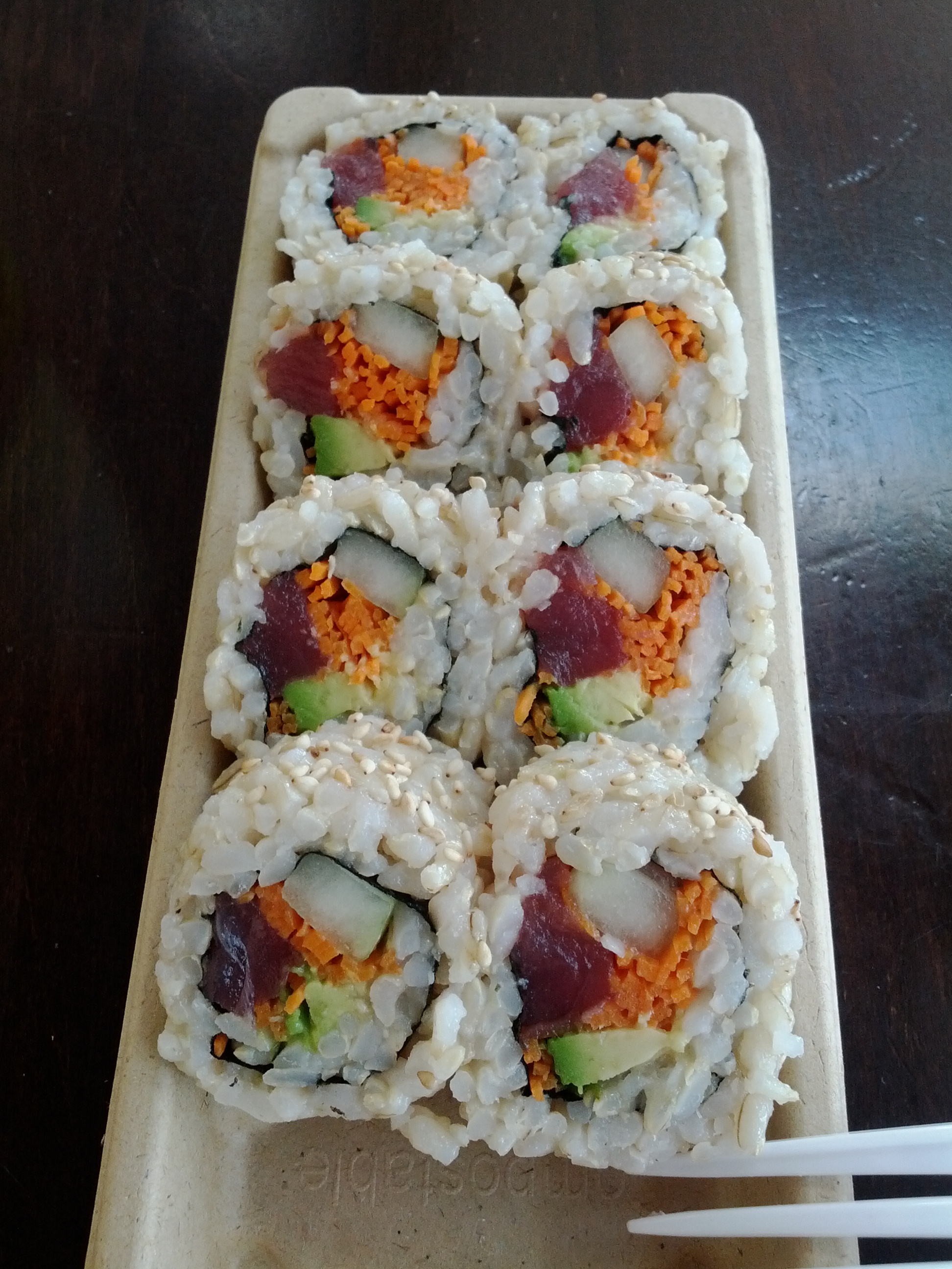 Whole Foods is one of those places that is always busy. Any time of the day that you drive past the parking lot, there are cars there. Well, lunch time is even busier. Amongst the people doing regular grocery shopping, there are a ton of people stopping in to get lunch. This was my first time being there for lunch and I was shocked with all of the people. People were getting items in the pre-made food area, pizza, deli, and for us, the sushi bar. Rather than getting pre-made sushi, we opted for the sushi bar. Greeted by very kind staff, I was ready to begin this fun time.