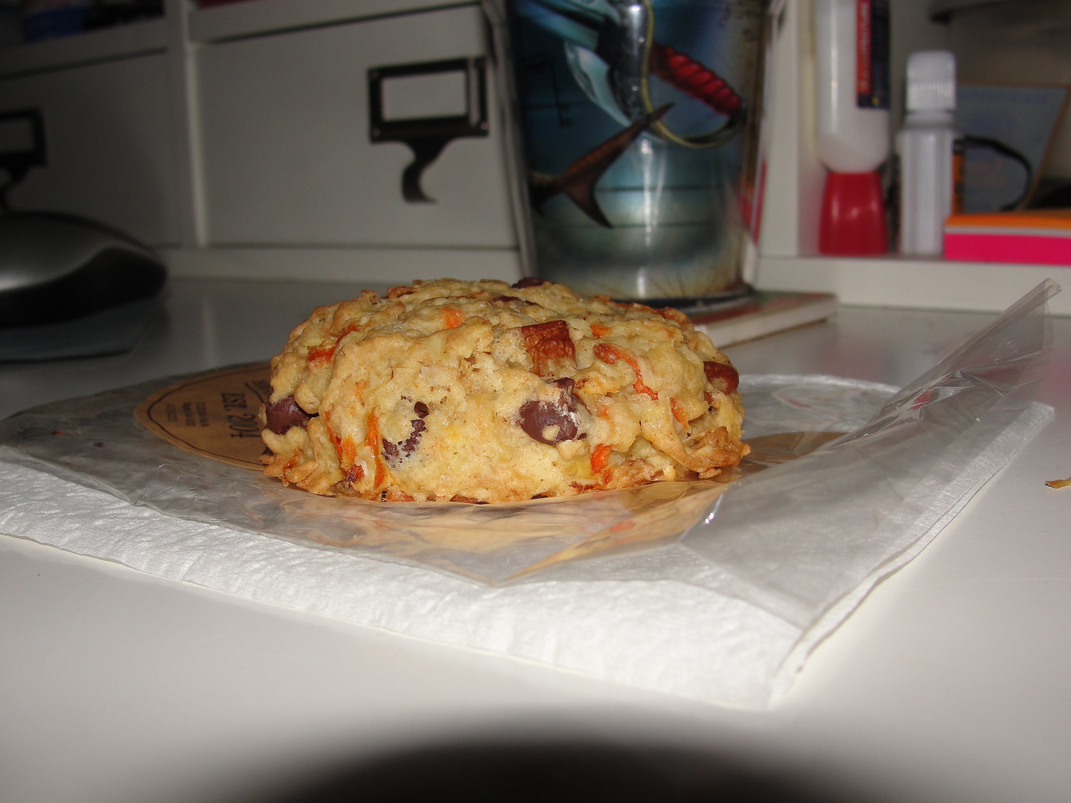 Now, this cookie contained no description as to what kind it was. At first look, I could see shredded pieces of carrots, a white shredded substance, walnuts and chocolate chips. And, it looked somewhat oaty. I don’t recall ever having a cookie before that contained carrot pieces. I was quite intrigued and brought the cookie home to try.
