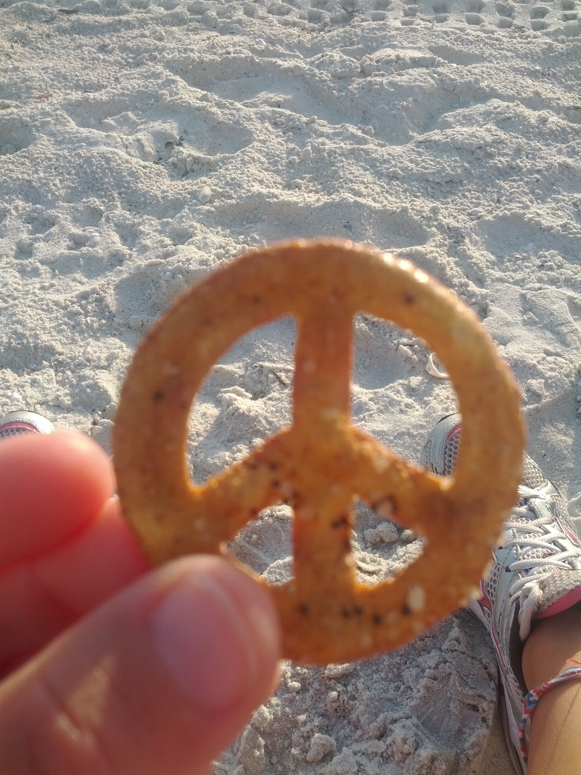 We arrived at the beach and made our spot. As we watched the sun begin its descent, we ate our sushi and opened up the bag of pretzel chips. When I opened the bag, I found these little suckers were in the shape of a peace sign. Once I looked at the bag again, I saw the outside of the bag had this peace sign shape as well. Now, I was even more intrigued and dug my hand into the bag and grabbed a few.
