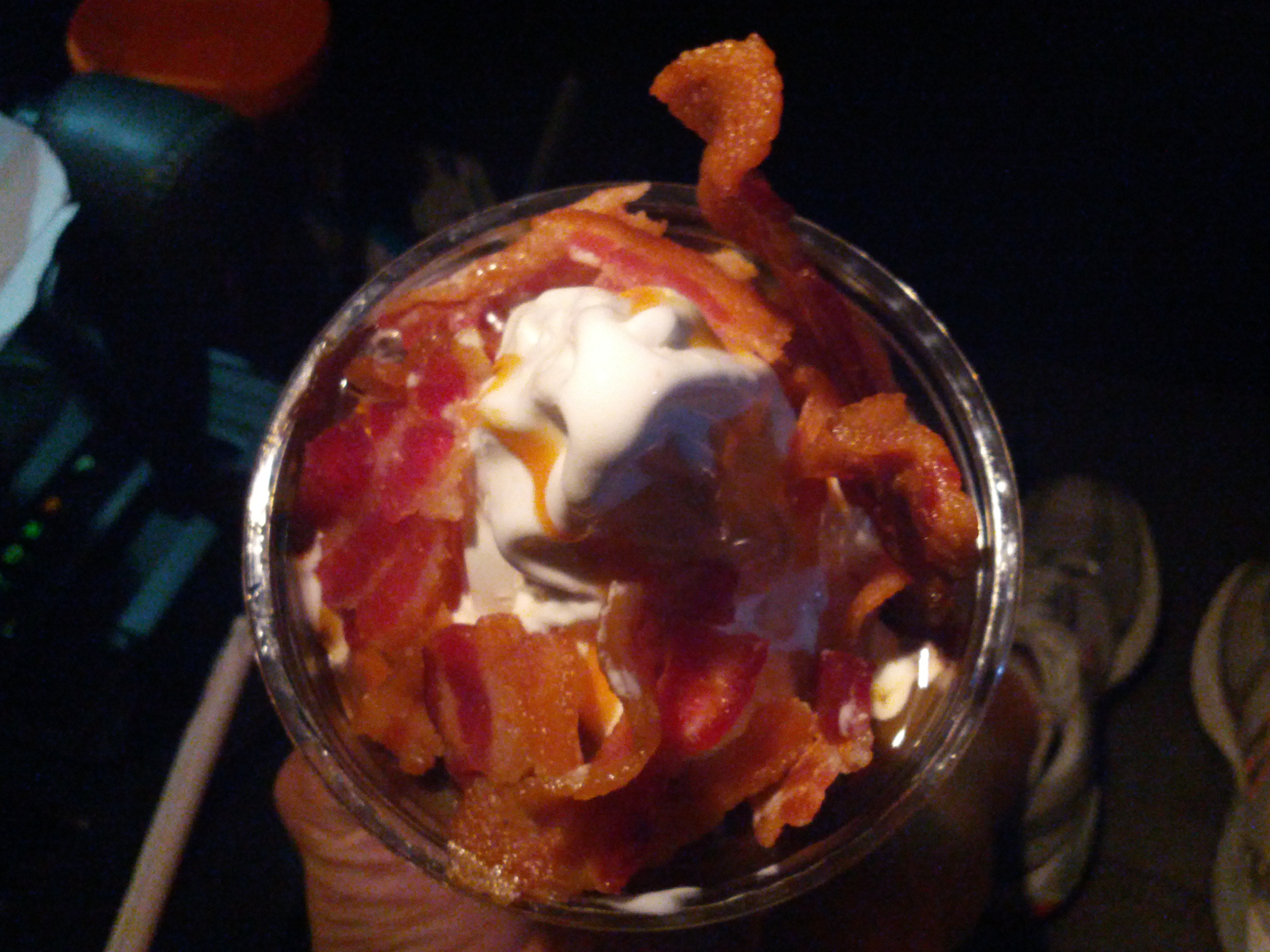 This Bacon Sundae had an insane amount of bacon on it. While I did not see any chopped pieces of bacon, I saw 4 huge pieces and additional segments of smaller pieces. This thing was loaded. I also thought the weight of the sundae was pretty hefty. The cup was entirely full of ice cream with the bacon & sauces topping it off. Even though I do not like bacon at all, I decided that I needed to try one bite of the sundae with the bacon. I scooped up ice cream, a smaller piece of bacon, caramel & chocolate sauce and placed it in my mouth. As the flavors began to permeate my taste buds, my mind began to realize this was one Porky Treat.