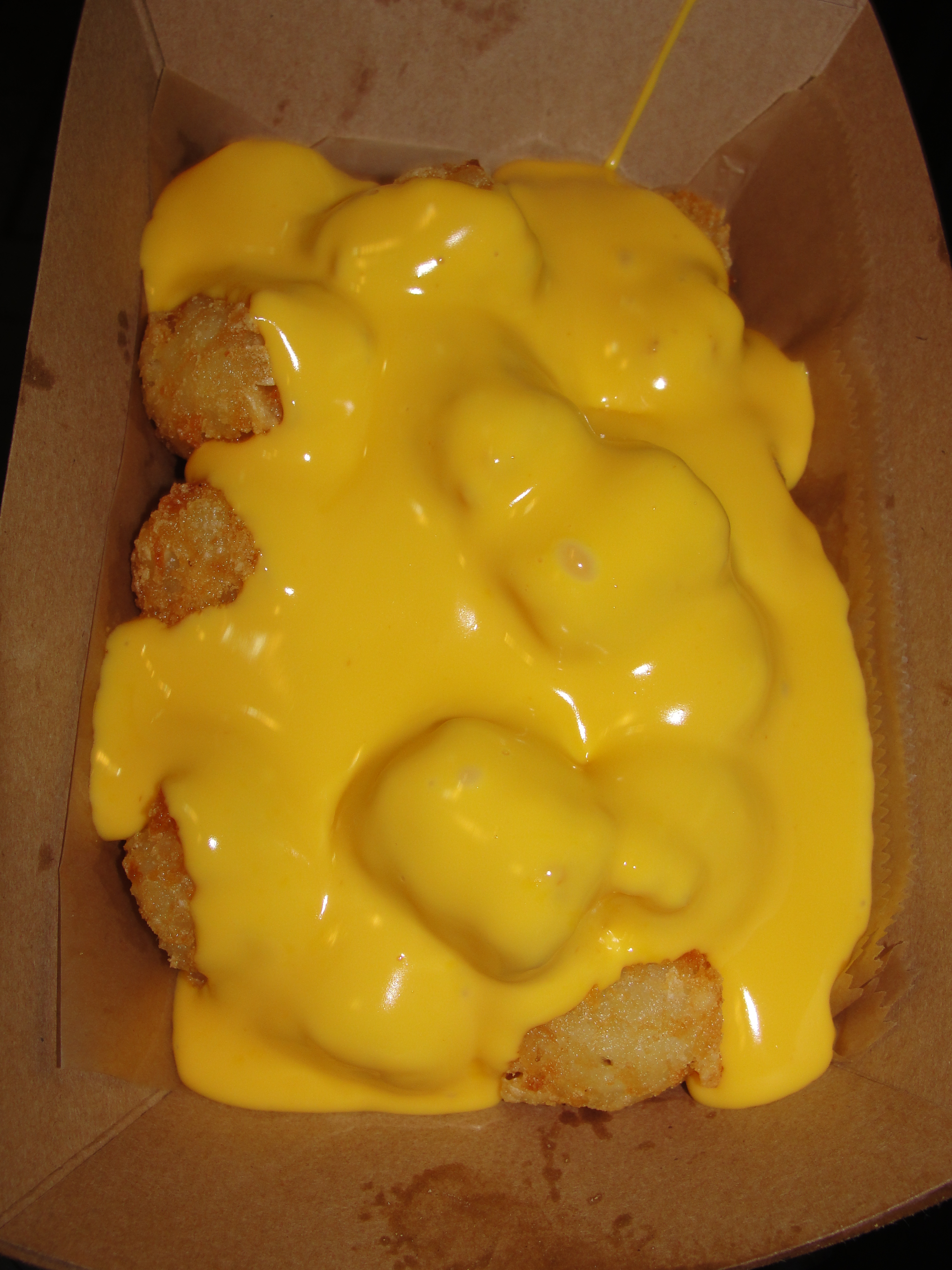 My bowl/plate arrived very hot to the touch and was loaded with tots and a ton of cheese sauce. After making our way back to our seats, I dug in. The first thing I noticed was the fact that there was entirely way too much cheese sauce. It simply drowned the tots. This is really a bummer because the cheese sauce in moderation, was good. Yes, it was just your basic out-of-the-can cheese sauce, but the taste was creamy, cheesy and smooth. I enjoyed it in moderation and may have had a bite or two at the end of only cheese. Grandma shares it all here.