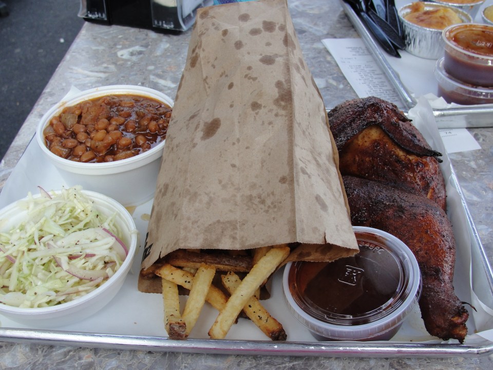 The first thing we saw was that Smoque was packed. We got one of the last parking spots and the line was out the door. While there were some tables available outside (it was warm…these people don’t do heat like us Floridians), the inside was packed. After waiting in line for 30 minutes, we arrived at the counter to order. The system at Smoque involves waiting in line, going to the counter, placing your order and being sat by a host. Once you are sat, your host brings out your food when it is ready. Since we had 30 minutes to choose our offerings, we were ready to go at the counter. I do not eat pork or much beef so, I usually go with chicken when it comes to BBQ. Mommy and Taylor ordered the brisket while I opted for the BBQ Chicken. I selected Fresh Cut Fries, Baked Beans and Cornbread as my side. We made our way to our outdoor table and anxiously awaited the arrival of our food.