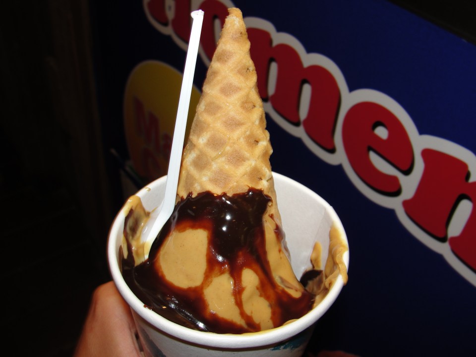 As the girl began preparing my order, I was thinking to myself maybe I should have just gone with the Normal Ice Cream in the Normal Waffle Cone. But, what the heck – right? You gotta live. My bowl arrived and the outside felt hot to the touch. I paid and dug right in. Basically, my bowl consisted of the Chocolate Peanut Butter Ice Cream, Hot Fudge, Hot Peanut Butter and a Waffle Cone on top. I began with the ice cream which was all mixed with hot fudge and peanut butter. Actually, the first bite or two, contained no ice cream. But, since I am someone who regularly melts peanut butter and eats it with a spoon, this was just fine by me. The hot fudge was hot, thick, gooey and delicious. Every single bite of it contained all of these features and, even at the bottom of the bowl, the hot fudge was still thick & gooey albeit, no longer hot. While the fudge flavor was not overly dominant, it was there and the fact that it was so thick & gooey, made up for any lacking flavor.