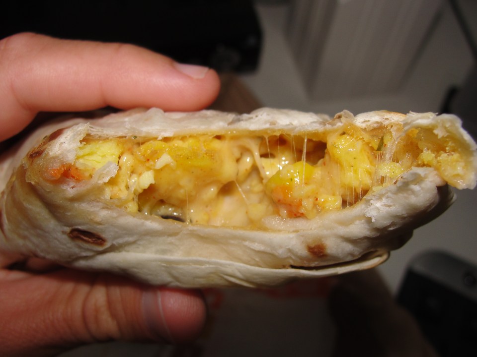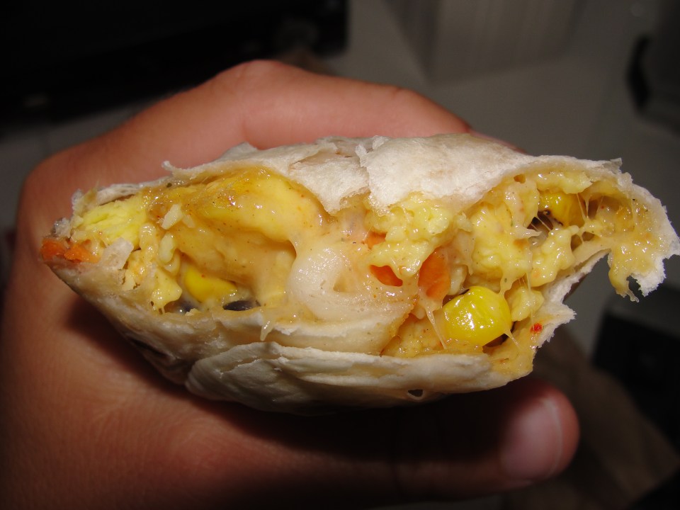 After my first few bites, I was really not tasting too many flavors. I could see the eggs, cheese, potatoes and some veggies but, there was really no flavor to any of it. I found the tortilla to be very lacking and flavor and quite chewy – CFA wins in this area. I really do not like scrambled eggs on their own, and can only eat them within a burrito. These eggs had no flavor whatsoever yet, they were warm and the consistency was good. I could see plenty of melted cheese but, I could not tell you what variety of cheese it was at all – it just tasted like your usual fast food cheese. As for the potatoes and veggie pieces, they were very soft and also lacking in flavor. I was feeling like I was in the twilight zone…so many elements and yet no flavor?