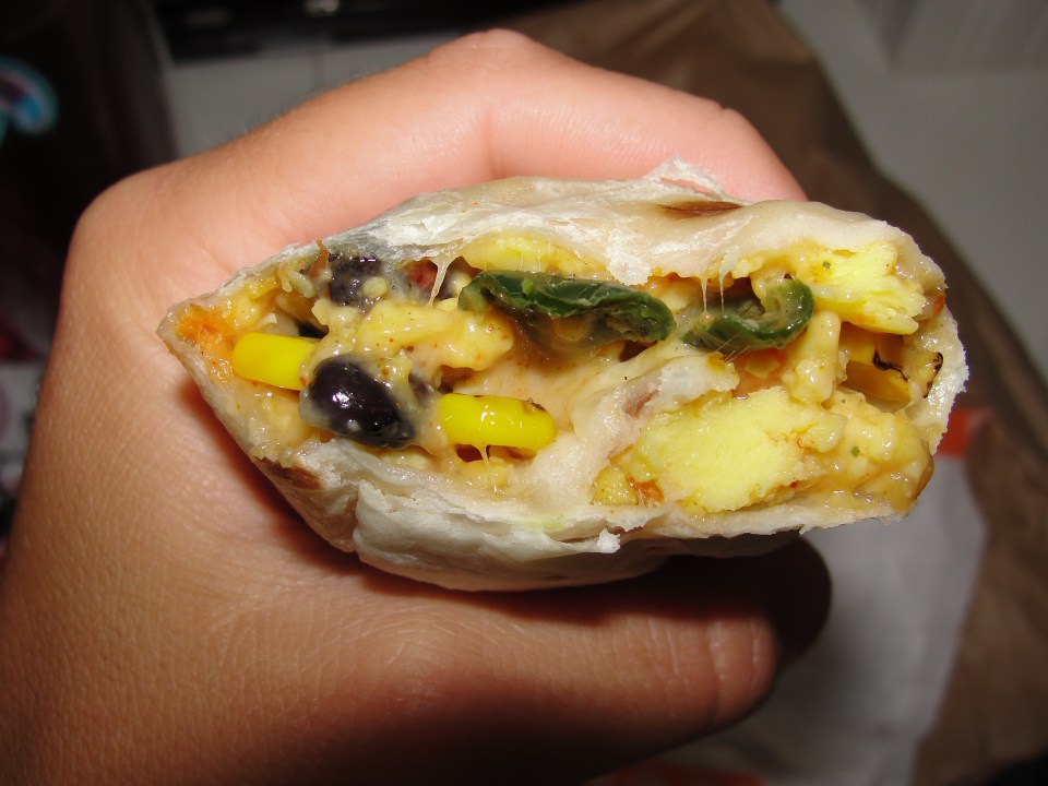 Overall, I think I would really have no reason to get this burrito again. For the amount of calories, I would have expected it to fill me up more and at least have some flavor. Grilling the veggies (like CFA does), and making the cheese more of a dominate flavor, would have helped this burrito tremendously. I really do appreciate that Dunkin came out with a meat-less burrito and I am glad that I tried it. In the end, I just would rather go on a sugar binge with Chocolate and Sprinkle Munchkins when I decide to do the Dunkin. From first glance to last bite, this veggie breakfast burrito from Dunkin Donuts, was One Funky Burrito.