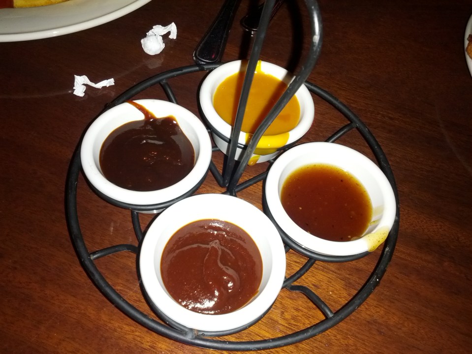 After waiting forever (it wasn’t really…I was just really hungry), our food arrived. I saw that there was no bbq sauce on the table so, I asked our waitress to bring us some. She brought us this beauty with 4 different sauces. These included sweet, spicy, mustard and asian. I tried all of the sauces on their own as well as with some fries. I found that I like the sweet and the spicy the most. While the sweet was not too too sugary, the spicy was also not really spicy. This gave both of the sauces a pleasant taste from start to finish. The asian bbq sauce was just not my cup of tea and reminded me too much of orange sauce. As for the mustard, it was just bbq and mustard – no real flavors stood out to me. I appreciate the options and we had no problem finishing all of the sauce.