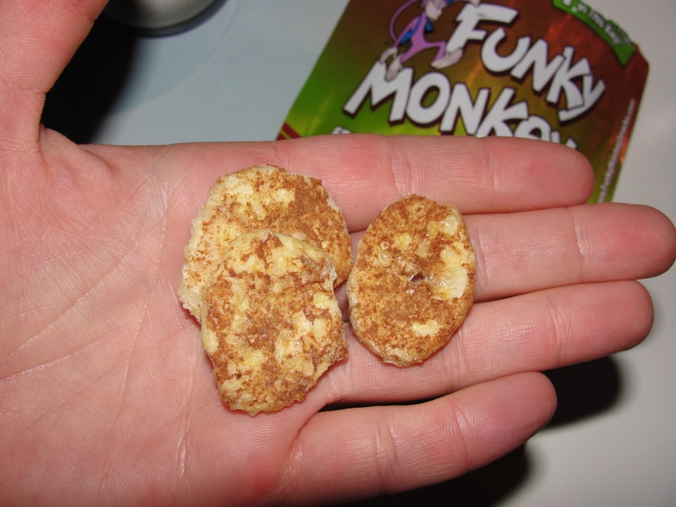 A month or so back, during my weekly food shopping visit to Publix, I saw a basket of these bags sitting in an isle. After further examination, I found that these goodies were called Funky Monkey and are Fruit that Crunches. I then saw that this was Freeze Dried Fruit. Remember the days when eating Space Food was really cool? I totally recall purchasing Space Food wherever I could find it and then finding the taste of it so disgusting. Even with that fact, I grabbed a baggy of this Funky Monkey. After sitting in the pantry for a week or so, I cracked this thing open and tried it out.