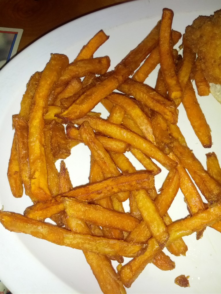 For my meal, I decided to go with the Chicken Sliders and Sweet Potato Fries. I wanted to try the fries and the sliders were one of my only choices. I guess I figured these would be grilled chicken but, I come to find out, it was fried chicken. While this usually isn’t an issue, it would have been nice if they specified on the menu. If they would have been so kind to do that, I would have never ordered these. What arrived to me were pieces of chicken tenders on a bun – that’s it. No cheese, no pickles, no sauces. I asked for bbq sauce to go with them and, it’s a good thing I did. The buns were stale and very sugary. The chicken tenders were fully cooked, but really had no main flavor. Without the bbq sauce – which was also subpar – I would not have been able to eat these whatsoever.