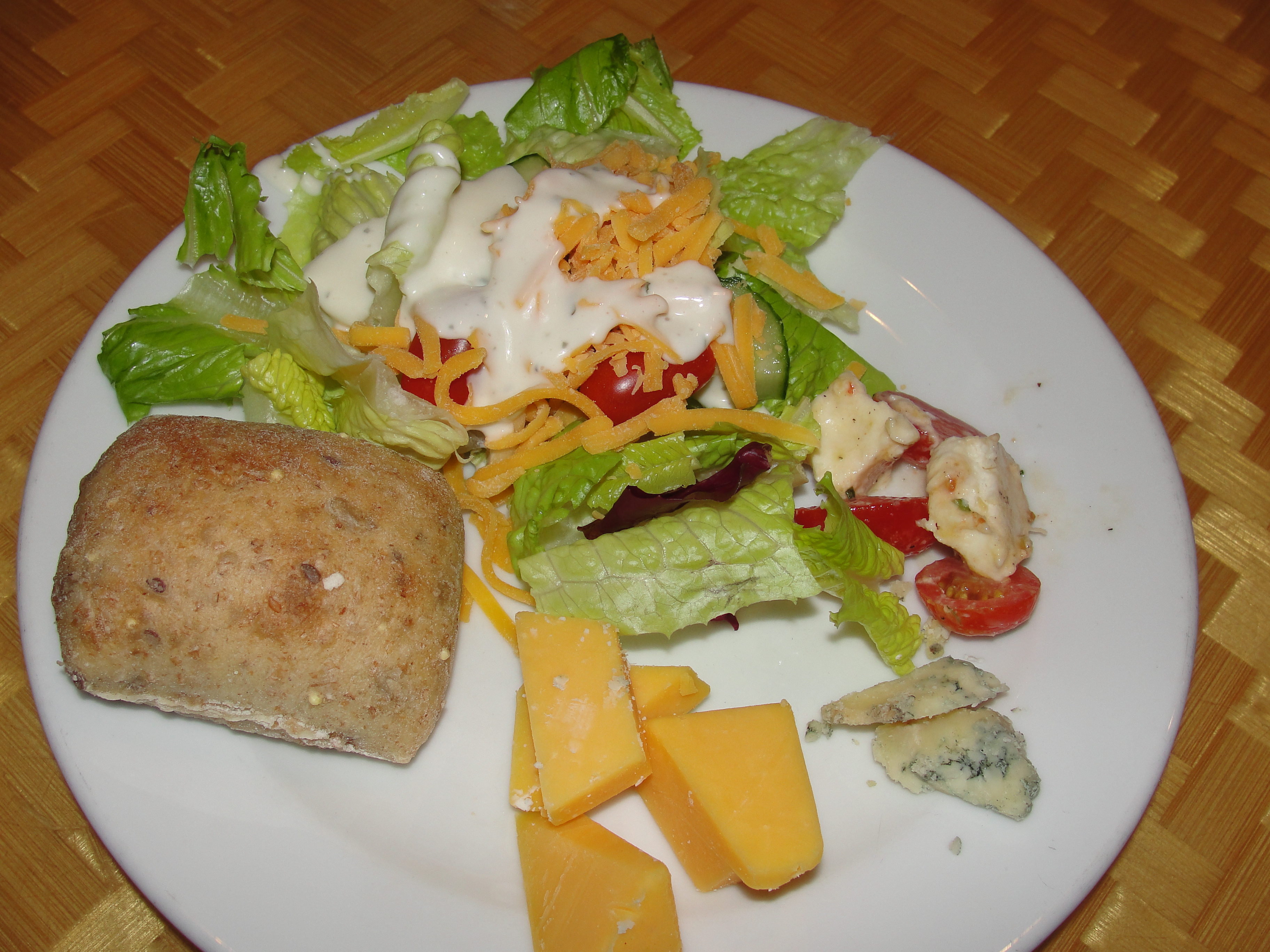 Plate 1 consisted of salad, bread and cheese. The salad was very good with all pieces being cold, crisp and fresh. I probably could have had 2 more plates of salad, and thinking back now, I def should have. Nothing beats starting a meal with a nice salad. I opted for ranch as my dressing but, used just a little bit of it. A little bit was more than enough to give my lettuce, tomatoes, cucumbers & cheese some extra flavoring. The cheese pieces were cheddar & blue cheese from the cheese bar. The blue cheese was very mild but, the cheddar was really good. I enjoyed it greatly and felt the flavor was spot on. I also had a few bites of tomato & mozzarella salad on this plate – this stuff was awesome. Totally awesome. So fresh & tasty. As for the piece of bread, this was multi-grain and a bit dry. The flavor was okay but, nothing too amazing.