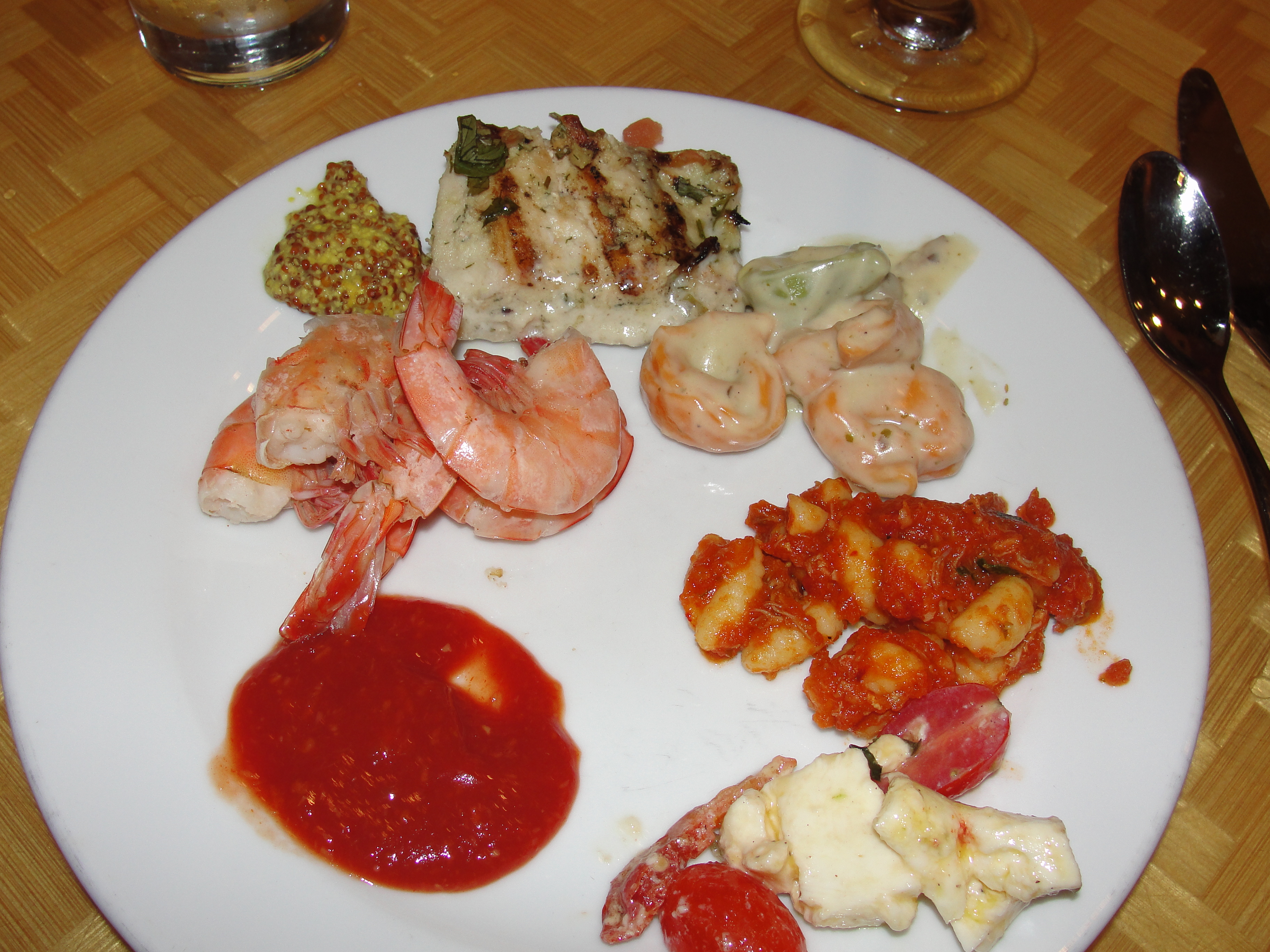 Plate 3 consisted of peel & eat shrimp, swordfish, tortellini, cavatelli and tomato & mozzarella salad. Besides the peel & eat shrimp off my plate, I also helped myself to a large plateful that we brought for everyone. Delicious is the best way to sum these suckers up. The piece of swordfish I had was very moist & tasty. I enjoyed it with some fresh mustard (look at the size of those seeds) and cocktail sauce. This fish was cooked perfectly and on a buffett…go figure. The tortellini was cooked with spinach, artichokes, mushrooms and cheese and was really good. It was so creamy and warm. Now, the cavatelli was cooked in mariana sauce with some sort of meat. I’m not sure what the meat was but, it was spicy and I didn’t love it much at all. Even with just eating the cavatelli pieces, the spice was there.
