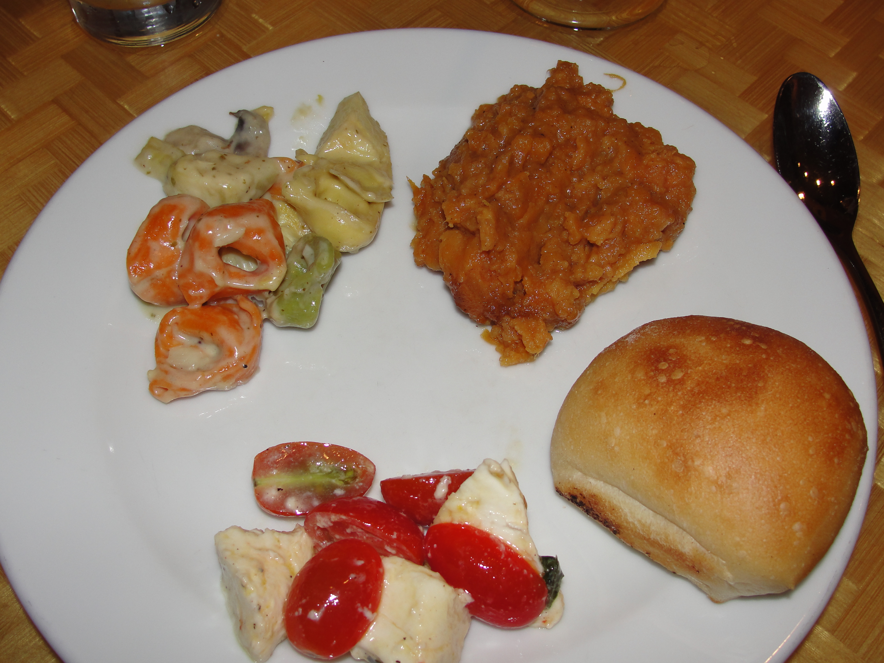 Plate 4 was more tortellini, sweet potatoes, a roll, tomato & mozzarella salad and some peel & eat shrimp that didn’t make the photo. Now, the sweet potatoes were labeled as sweet potato casserole, but, this was more along the line of seasoned mashed sweet potatoes. I did not taste any marshmallows or syrup – rather, I felt as if the sweetness came in the form of sugar & orange juice. Every bite had a bit of a citrus flavor to it, similar to orange juice. While I prefer the sweet potatoes I make at home, these were pretty good. The roll I tried this time around was also a bit on the dry side and lacked flavor. This probably would have been better with butter. And, let me just say, the tomato & mozzarella salad was the best I have ever had. When I say the cheese was fresh, it’s an understatement.
