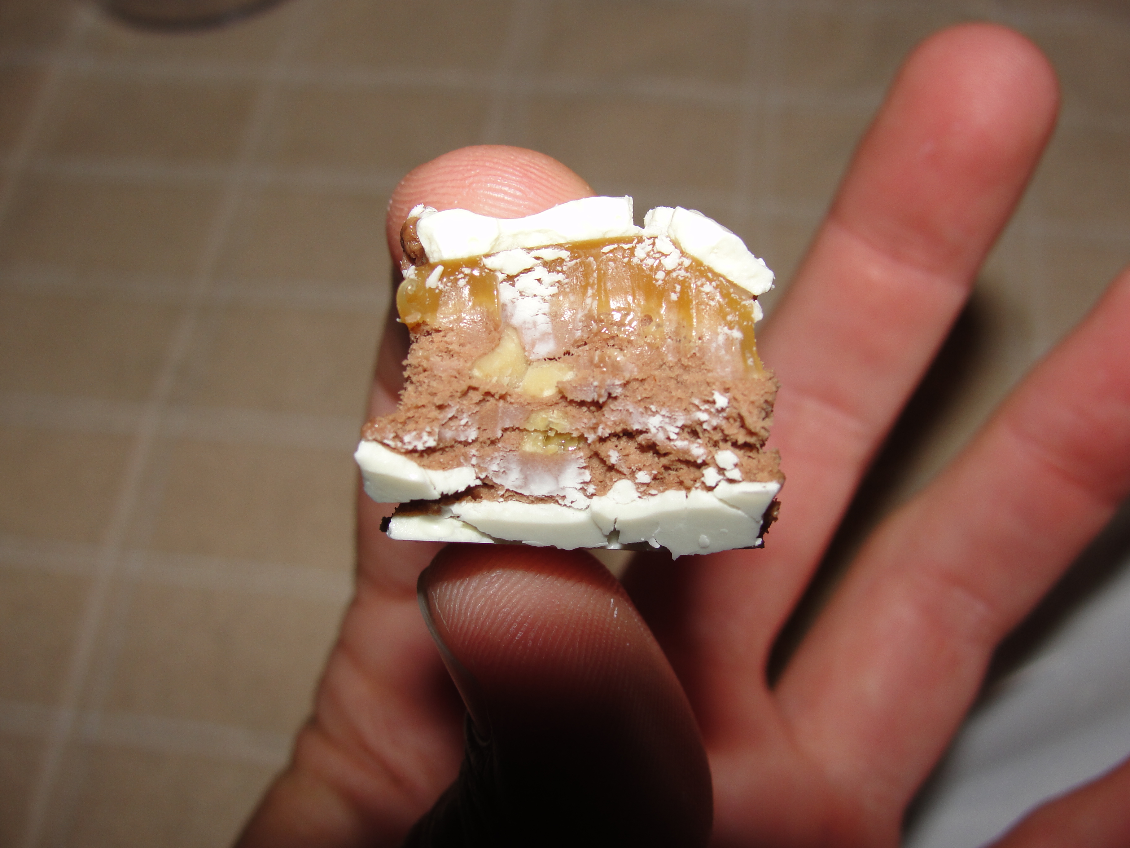 At first glance, this looks so odd.  Since it is covered in White Fudge, rather than the more-common milk chocolate, the appearance takes you back.  I cut off a piece and examined the layers.  The nougat was by far the largest part of this bar and I could see a sliver of a nut within the nougat.  The top of the bar contained a thin caramel layer.  And, all of this was covered in white fudge.  I stuck the first piece in my mouth and began to chew.  Where was the candy bar?  Was I truly eating Zero?