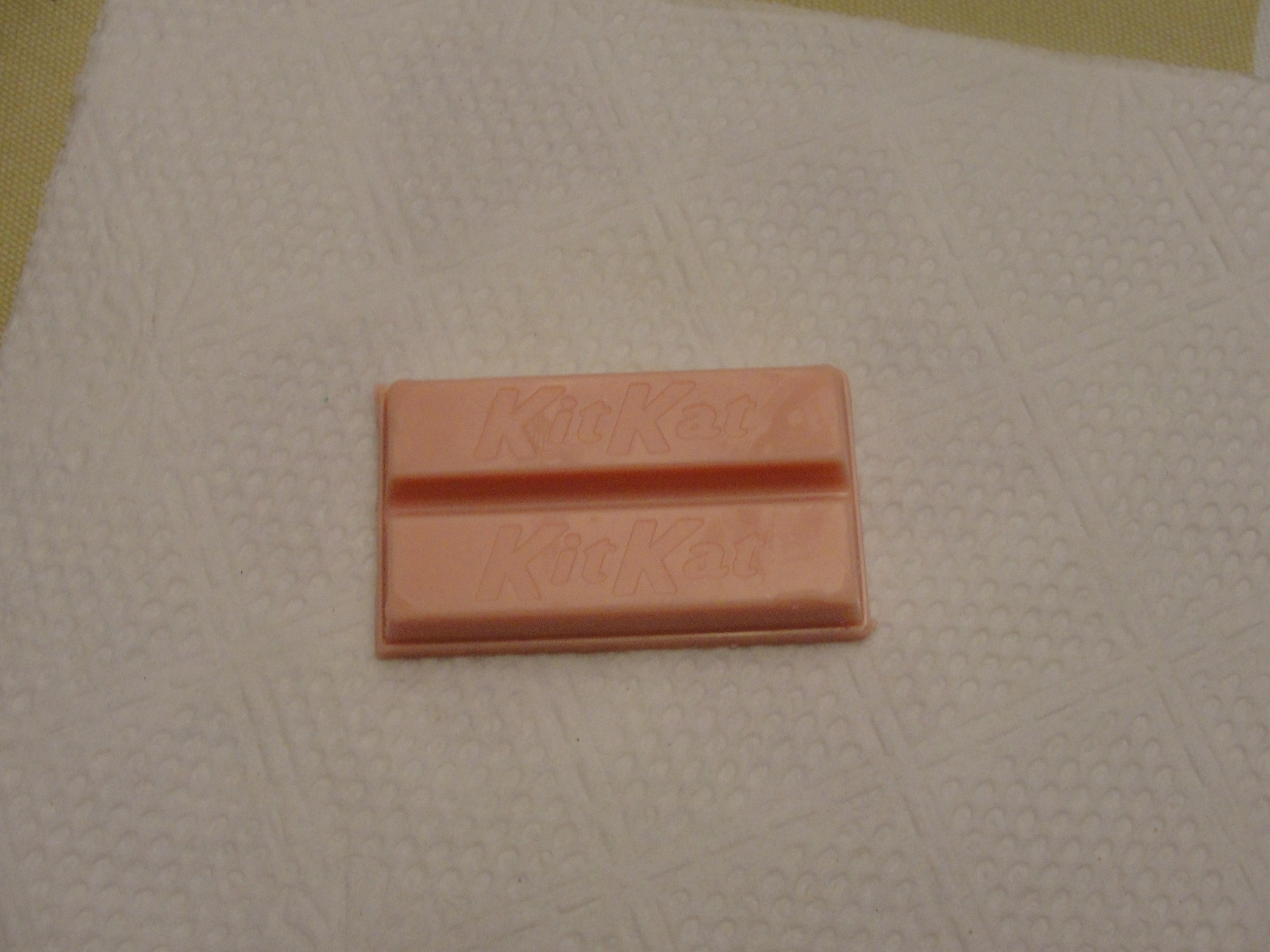 Well, the flavor was indeed quite different. While not quite along the lines of Strawberry Quik, I could indeed taste the strawberry flavor. The exterior coating seemed to be white chocolate, heavily flavored with strawberry. The flavor was more intense when I first began to eat the piece and it seemed to lessen as I finished and swallowed it. The interior of the Kit Kat was your traditional wafer filling – delicious as always. However, I did not feel as if the Strawberry exterior really played well with the interior. It felt to me like two different pieces, forced to sit together and be friends. Sorry friends, it’s just not going to happen. I finished my piece but did not feel inclined to eat any more.