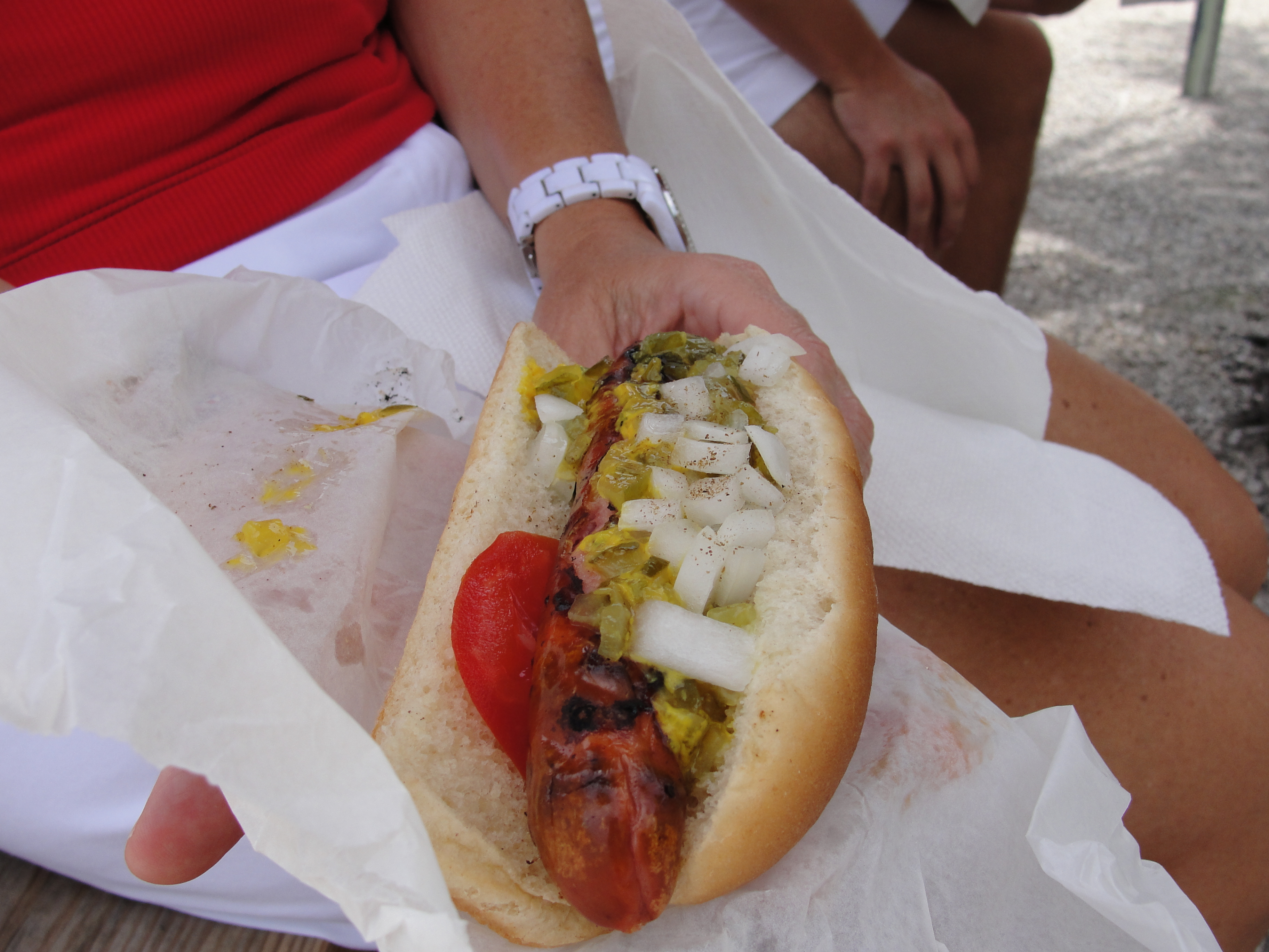 Our plan was to visit Schnapper’s Hots on Sanibel. They are a primarily hot dog serving location, located on Sanibel. Their tag line is Oh Boy! and the reviews seemed to be pretty good. We arrived at about 1:00pm to a packed house. After finding a parking spot, we ventured into the restaurant. This did not last long as the interior is about as small as a bathroom. I got all of the orders and stayed inside to order. This has the look and feel of a good ol’ home town location. Add this to the fact that it’s on Sanibel, and its a match made in heaven. After waiting to order, and waiting for our food, we finally began to eat at about 1:30pm.