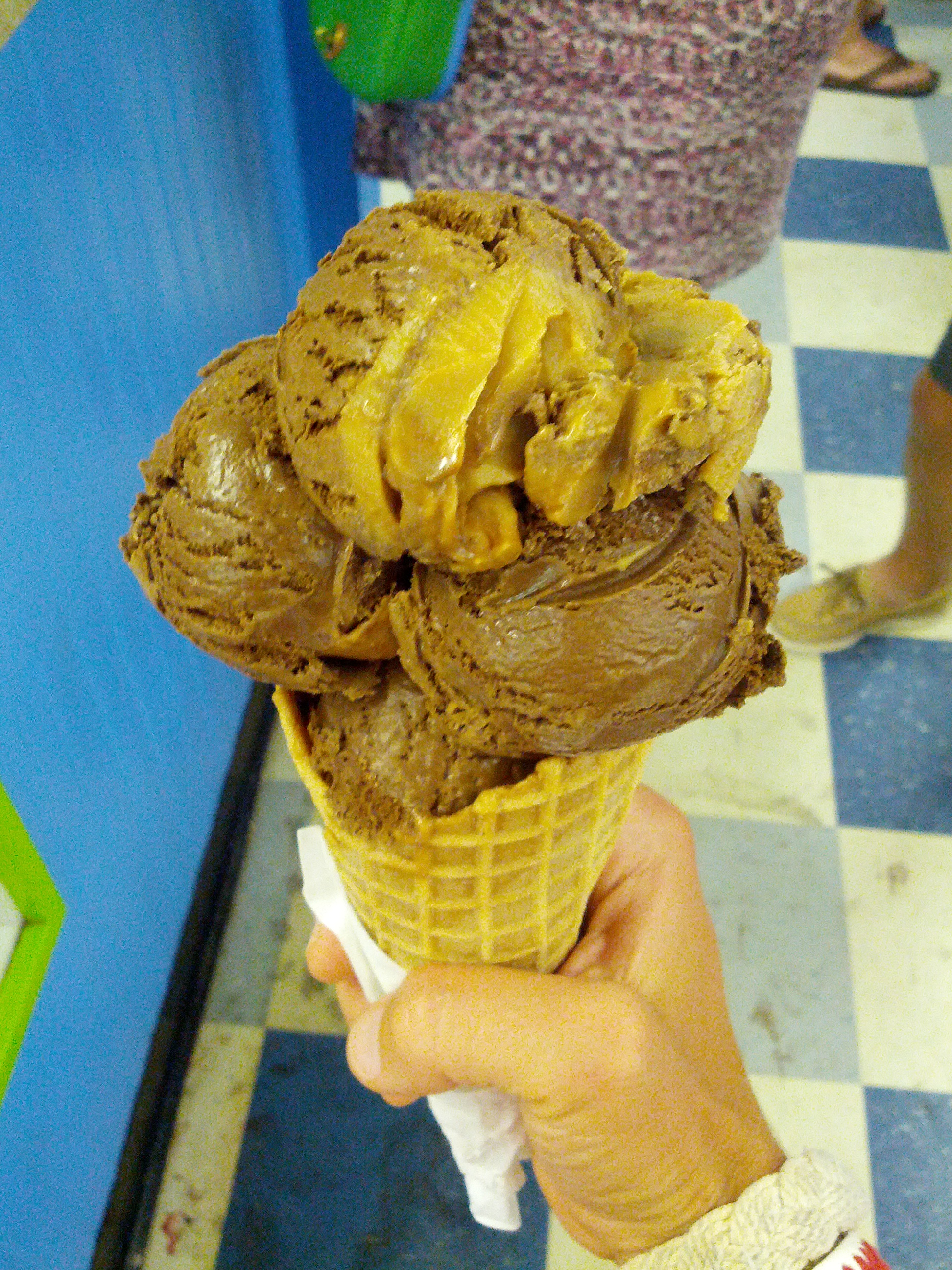 I opted for a small, as reading reviews told me this wouldn’t be small at all. When I was served my cone, this was indeed confirmed. There was nothing small here as heaps of ice cream poured out of the top of my waffle cone. I dug right into the ice cream which, lucky for me, included a bit spot of peanut butter. I found the peanut butter to be good but, not overwhelming. It almost seemed as if it needed more of a peanut butter taste. There were plenty of peanut butter swirls throughout however, these really did not stand out to me. Now, the chocolate ice cream itself, was awesome. It was extremely rich, creamy & smooth. Every single lick & bite provided me with a creamy-cocoa goodness. It was divine and absolutely tasted homemade. The only downside was that the chocolate ice cream was so good, and the peanut butter so sub-par, that they did not play well together. One did not compliment the other.