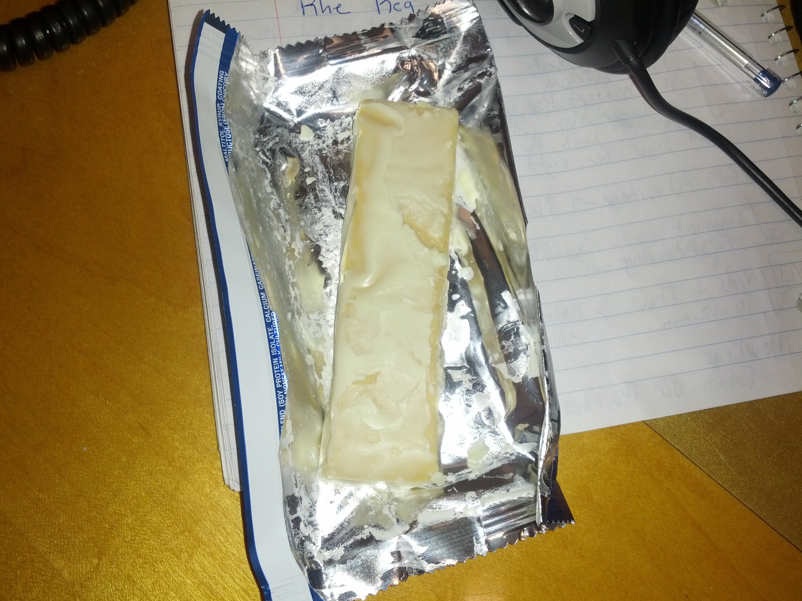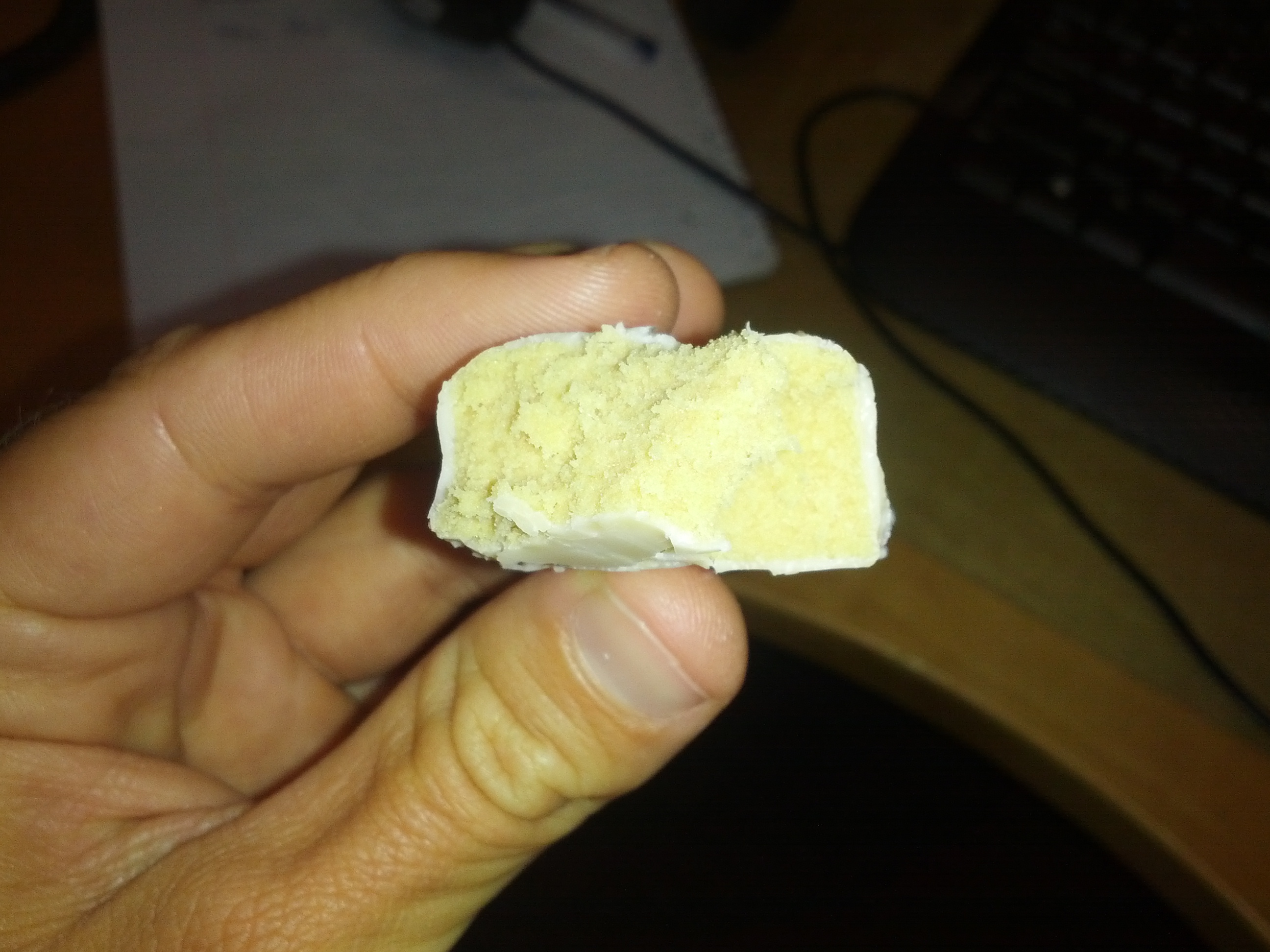 This PowerBar is in the 3-Series which is meant for After Workout. Boasting 20g of Protein and 210 Calories, this thing could easily be a meal. I was excited to try this and opened the bar up when we were feeling hungry. I noticed that the exterior of this bar was pretty similar to the millions of other bars out there. The coating was vanilla in color (well, no actually…vanilla is not this color…it was the color of vanilla ice cream) and this thing had a pretty hefty look to it. I broke off a piece for me, and a piece for my team-mate, and we dug right in.
