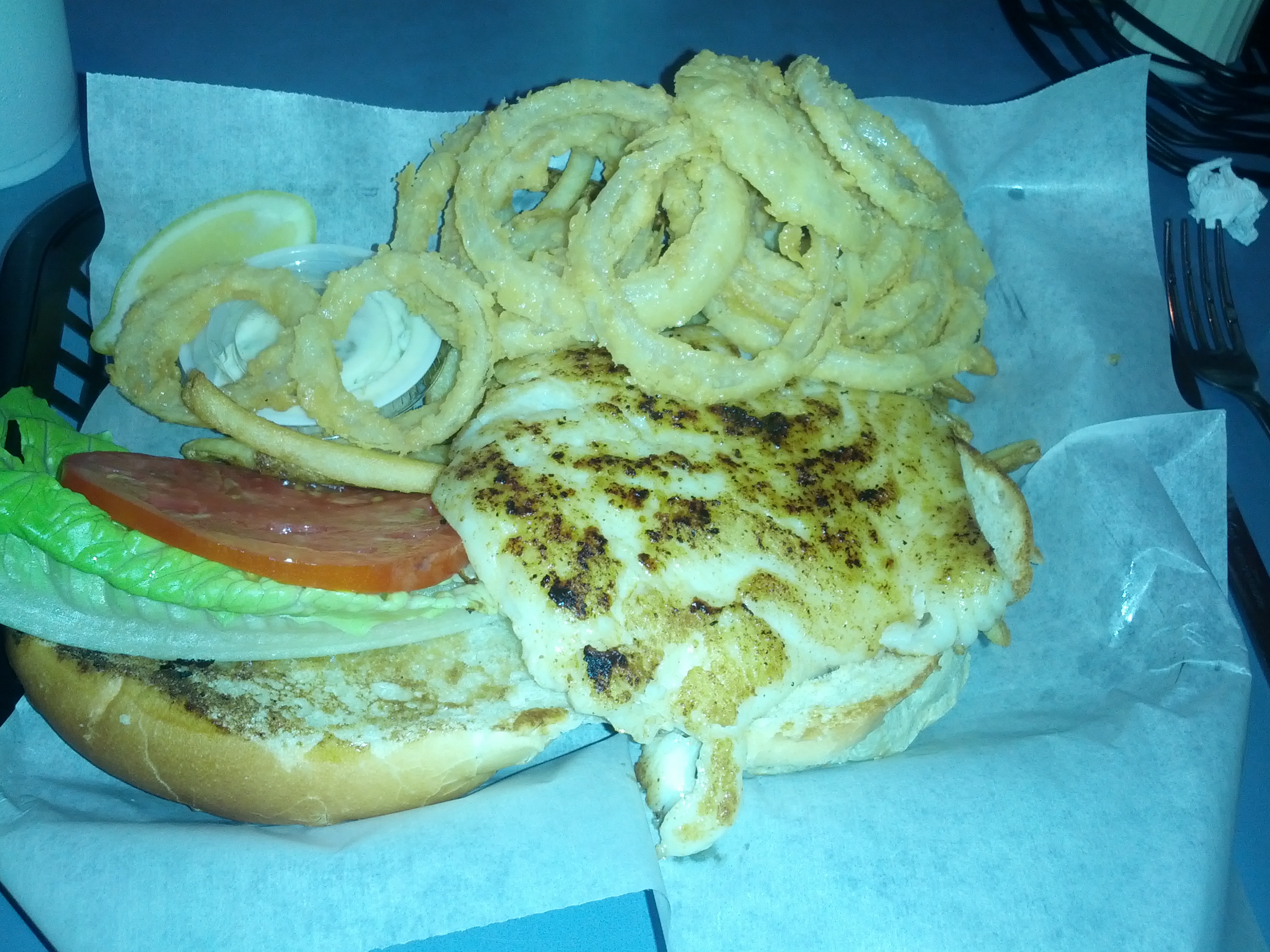 After browsing the menu, and the typically high seafood prices, I opted on the Grilled Mahi Mahi sandwich with a mix of fries and onion rings. As I have already reviewed those, we will focus this on just the sandwich. Now I must say, most buns from restaurants are simply huge. And I’m talking huge. Gigantic buns that simply over power the main subject of the meal. So was the case on this Steamers sandwich. Luckily, it wasn’t as noticeable as the sandwich was presented with the bun open.