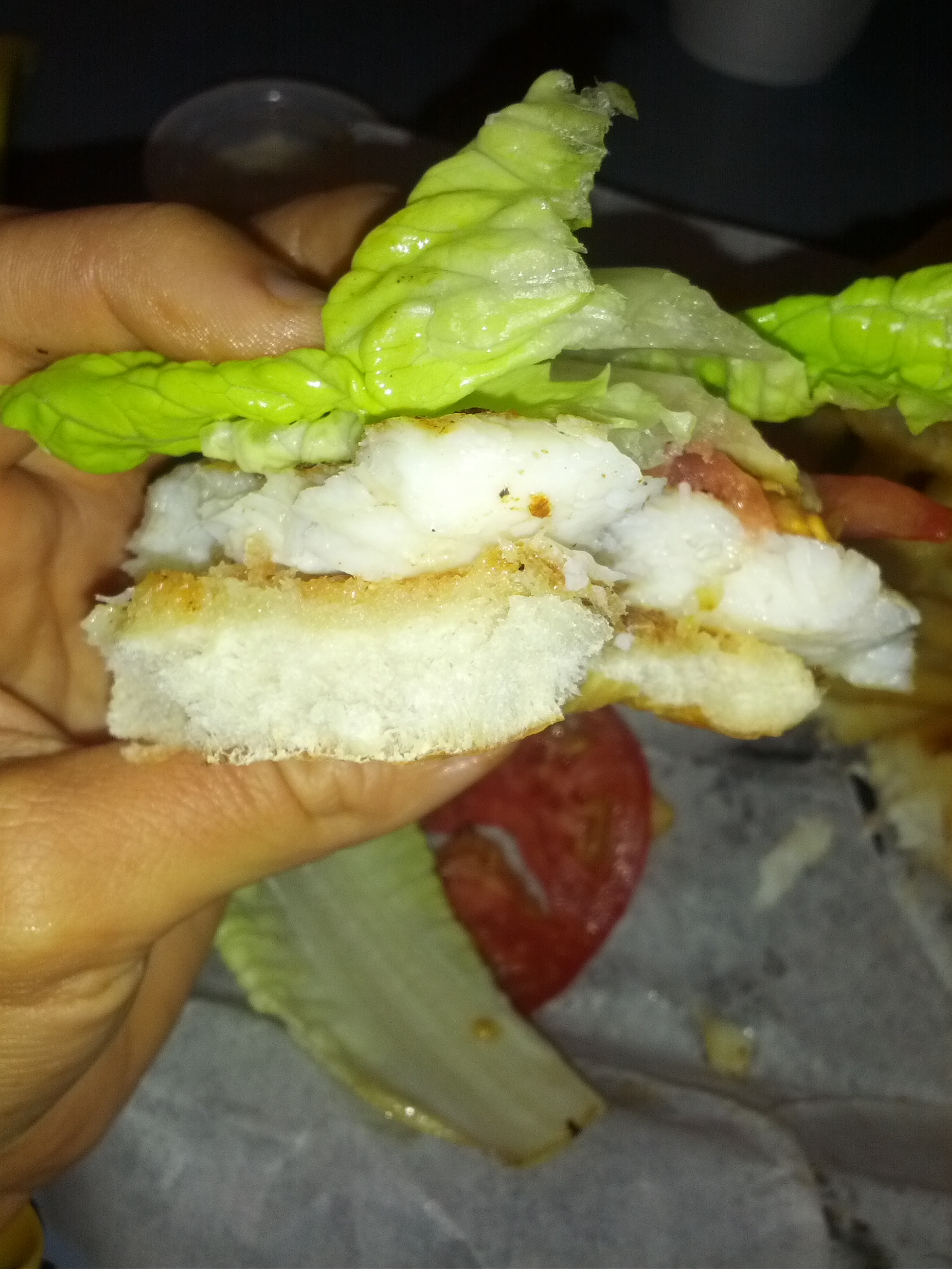 The first thing I did, was not eat most of the bun. I focused my meal on the mahi mahi, lettuce and tomato. I found this piece of mahi mahi to be great. It was lightly grilled which provided a slight chargrill to the exterior of the fish. The piece was somewhat thin however, it was perfectly cooked throughout. Every bite provided my taste buds with tons of good, fresh flavor. I found the fish to taste very mild and have no funky after tastes. With the addition of the lettuce and tomato, I felt as if the mahi mahi was really able to shin and be the star.