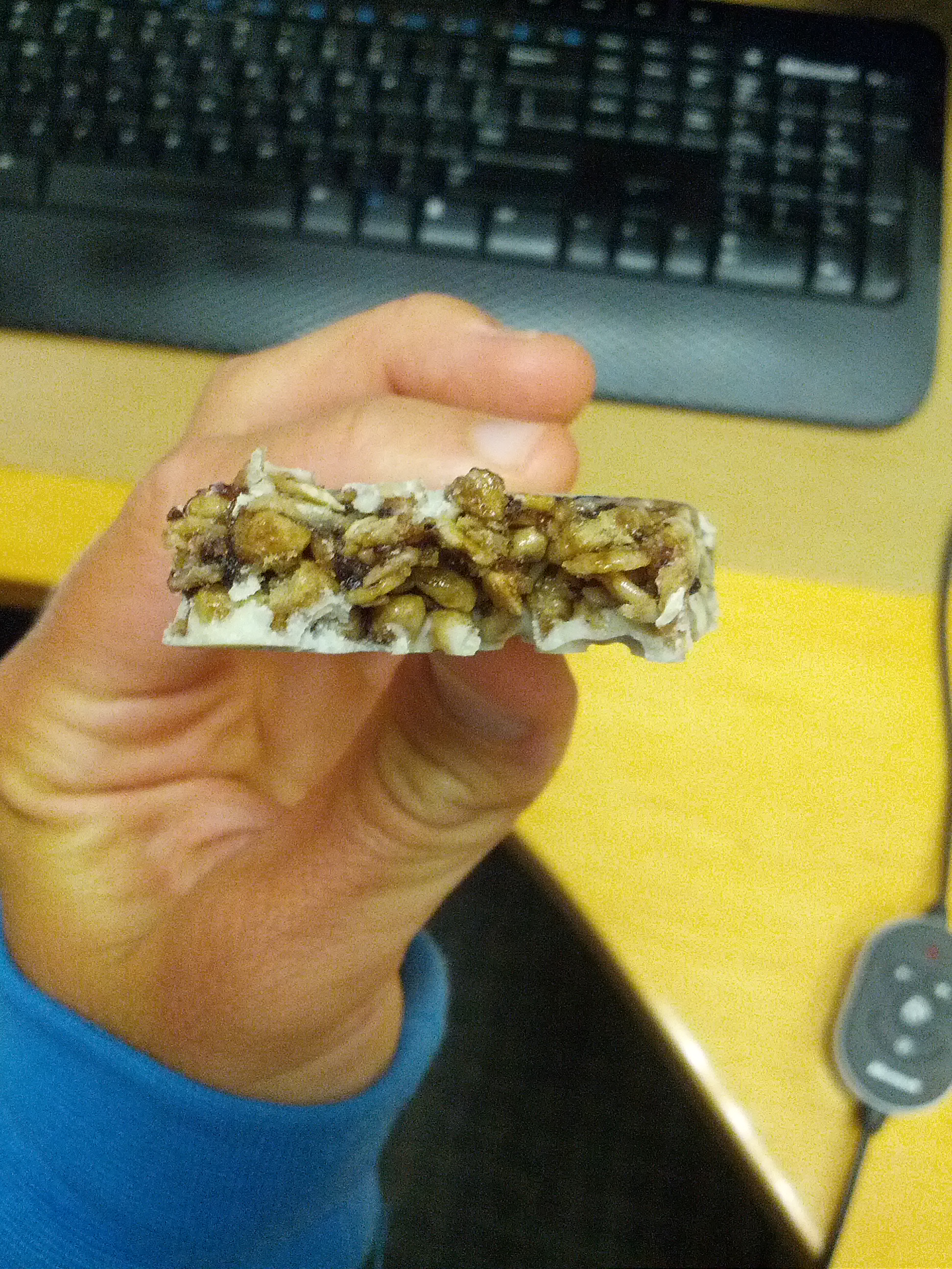 The first thing I could taste, hands down, was the Greek Yogurt. And, I don’t think this was a good thing. I felt as if the Greek yogurt completely overpowered the rest of the bar. As I continued to chew my pieces, the hints of blueberry and acai did indeed show their faces. However, I never felt as if I could taste the almonds contained within or the granola, in which most of the bar consisted of. The Greek yogurt just killed the flavor of everything else. And hmm, how do I describe what this tasted like? Think the mix of Yogurt Covered Raisins and the exterior of a Power Bar. Bingo…gross.
